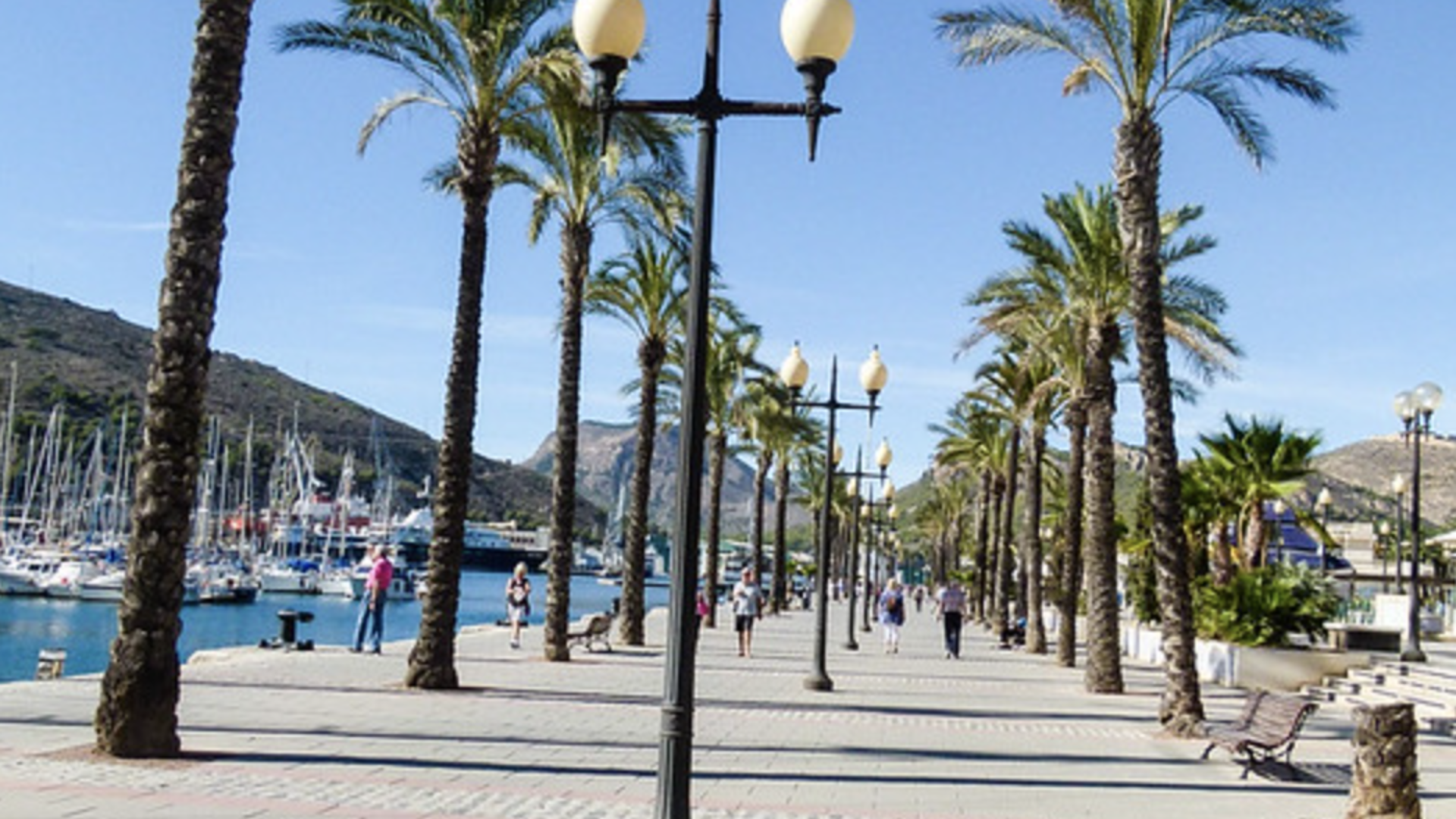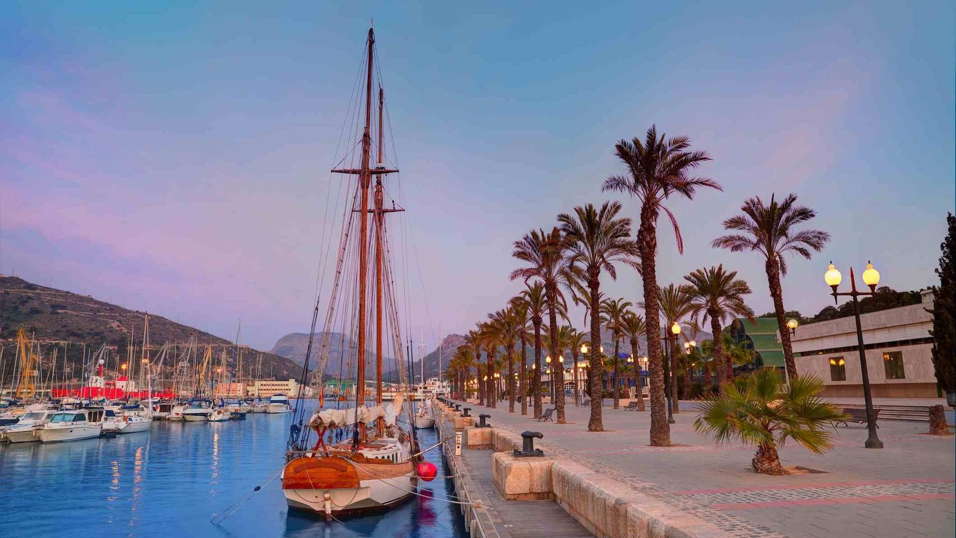 Cartagena heeft een prachtige kustboulevard langs de haven, waar vissersboten, jachten en cruiseschepen samenkomen.