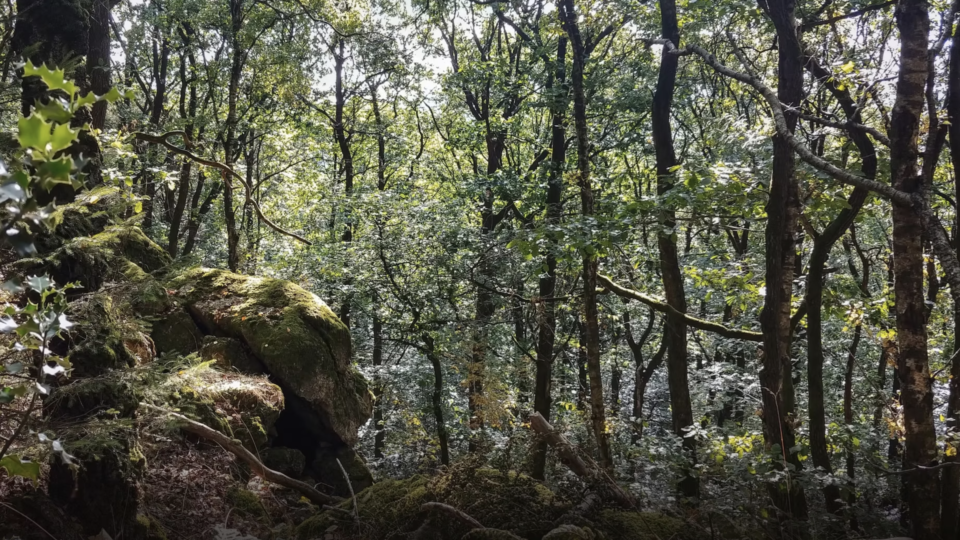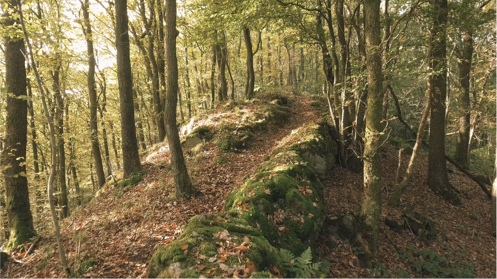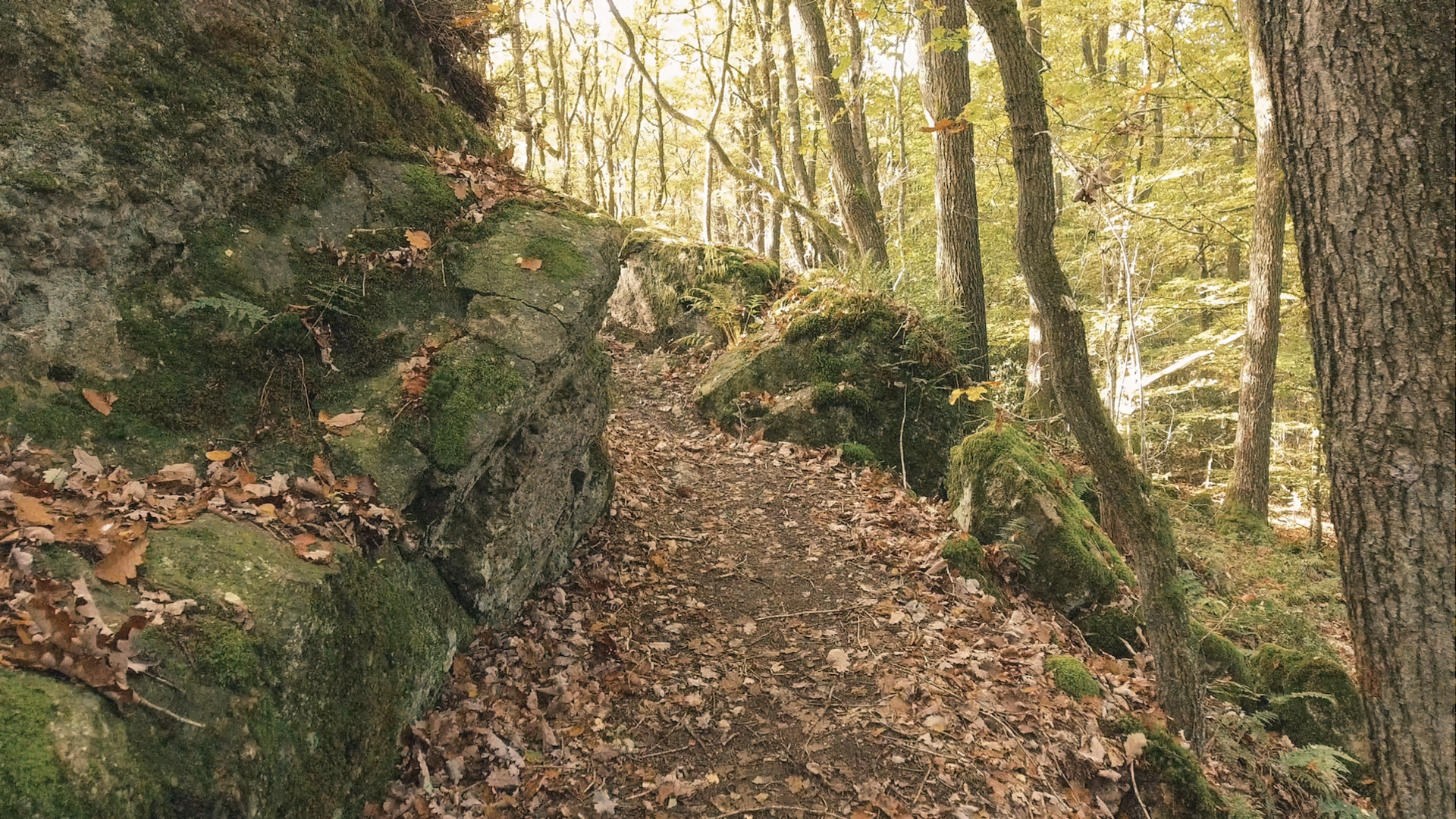 Wanneer je het pad naar het oosten volgt, bereik je de Kroon, een hoog punt van 380 meter. Onderweg veranderen de loofbossen langzaam in een smal, kronkelend pad. De rotsige punten die uit de grond steken, lijken op de rugschubben van een draak – een spectaculair gezicht! Het landschap voelt haast buitenaards: bemoste rotsen, diepe afgronden aan weerszijden en een sfeer die rechtstreeks uit Tolkiens wereld lijkt te komen. Een wandeling die je ademloos achterlaat.