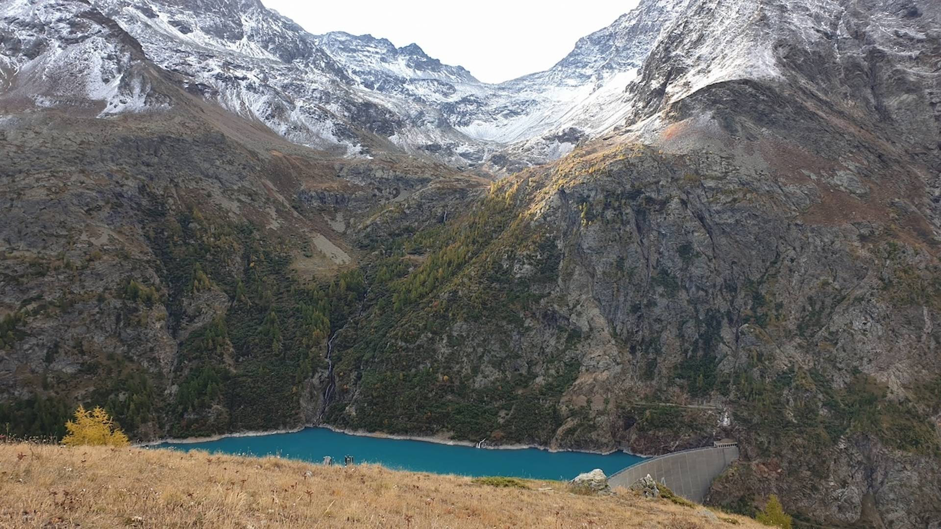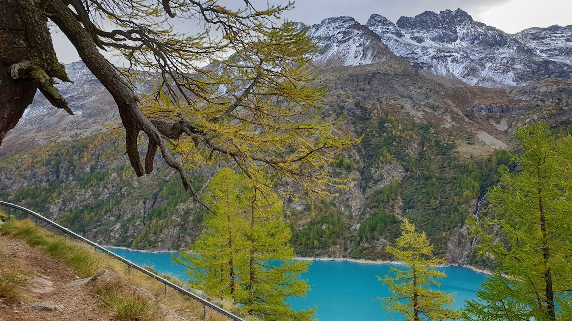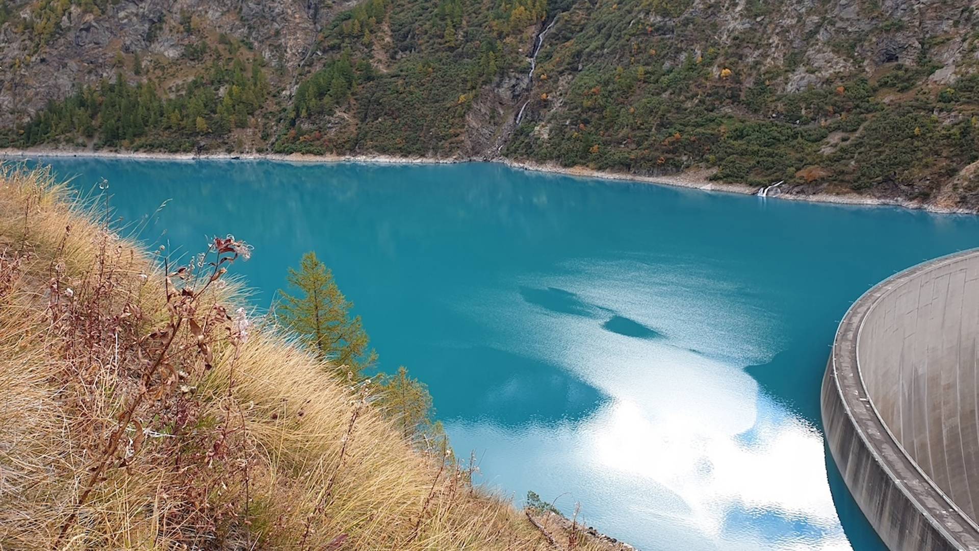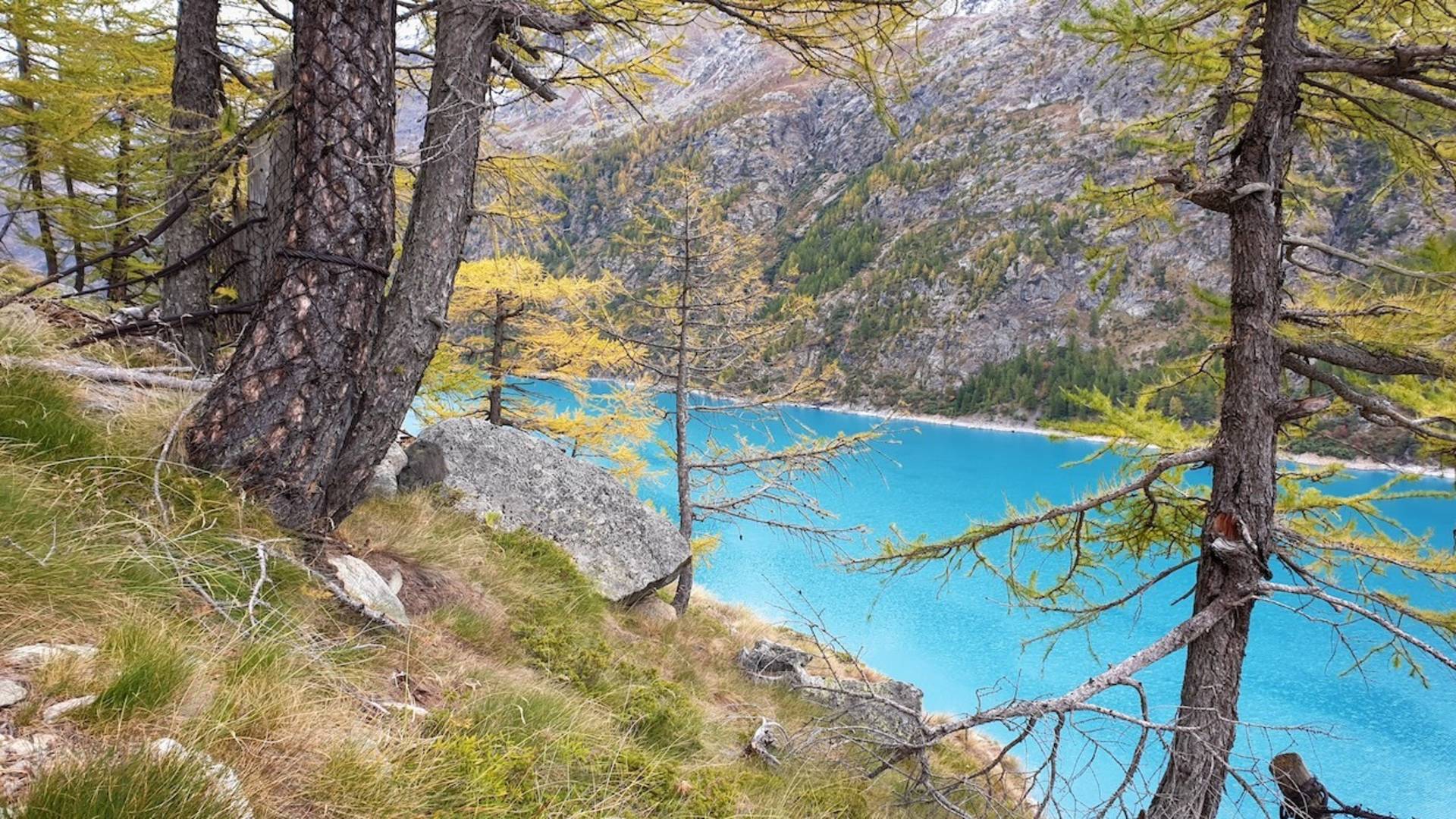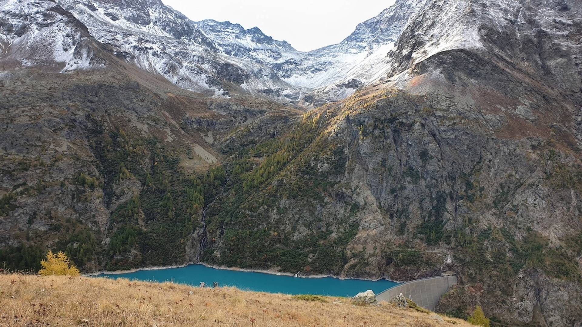 We deden deze hike op een stralende herfstdag, wanneer de goudgele lariksen fel afsteken tegen het aquamarijne water van de stuwdam beneden. De kleuren, het licht en de rust maken deze wandeling op zichzelf al bijzonder — maar het echte spektakel begint pas eenmaal onderweg.