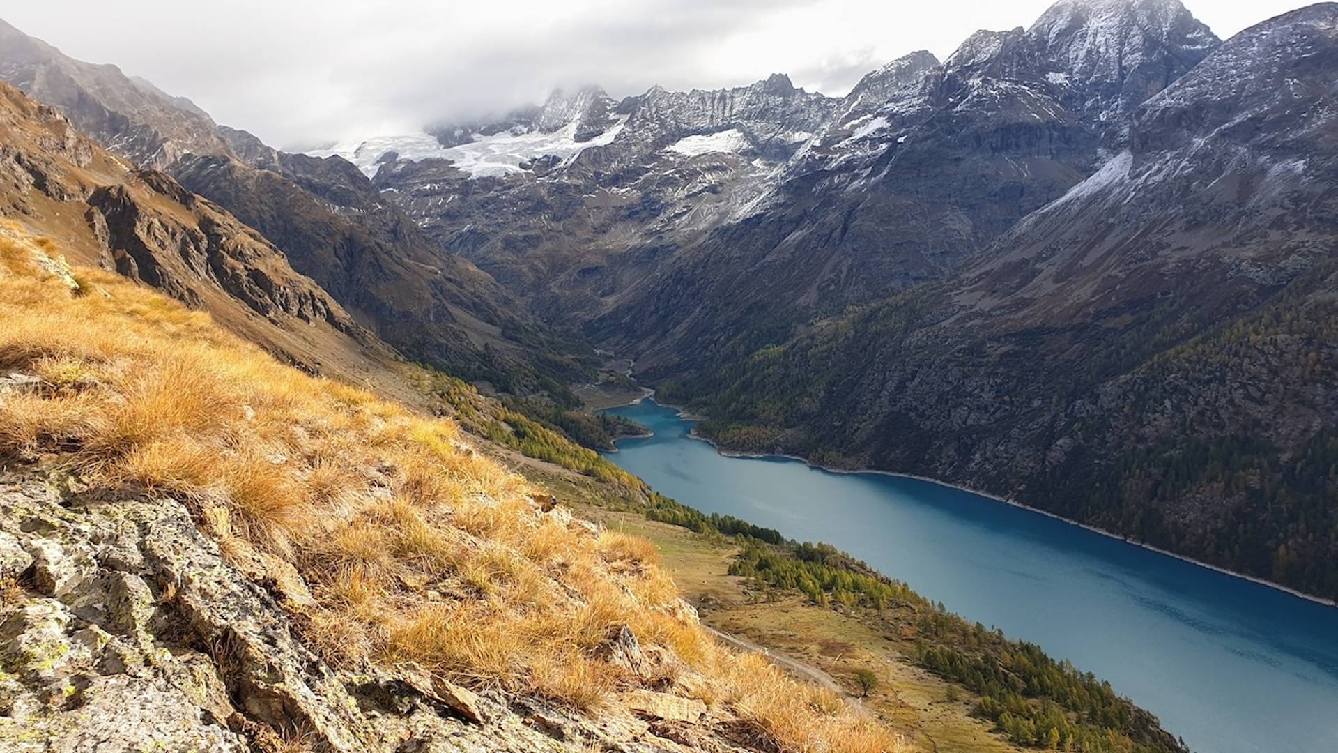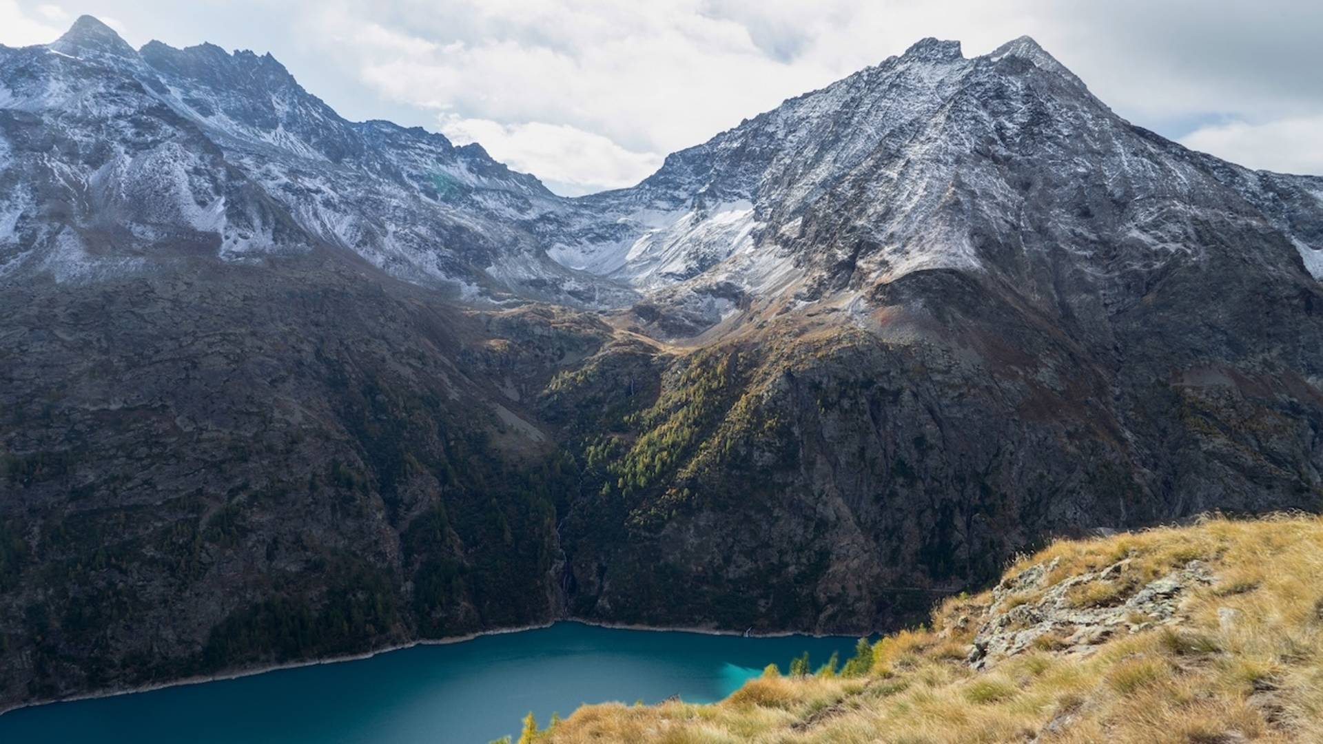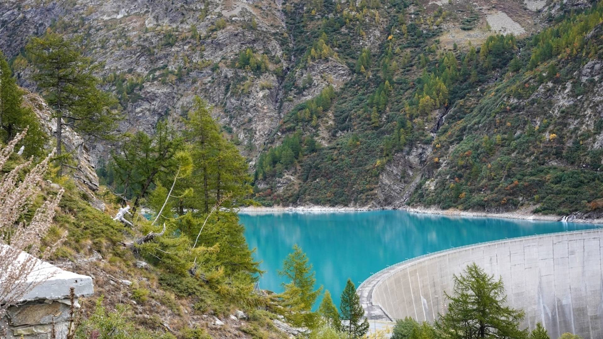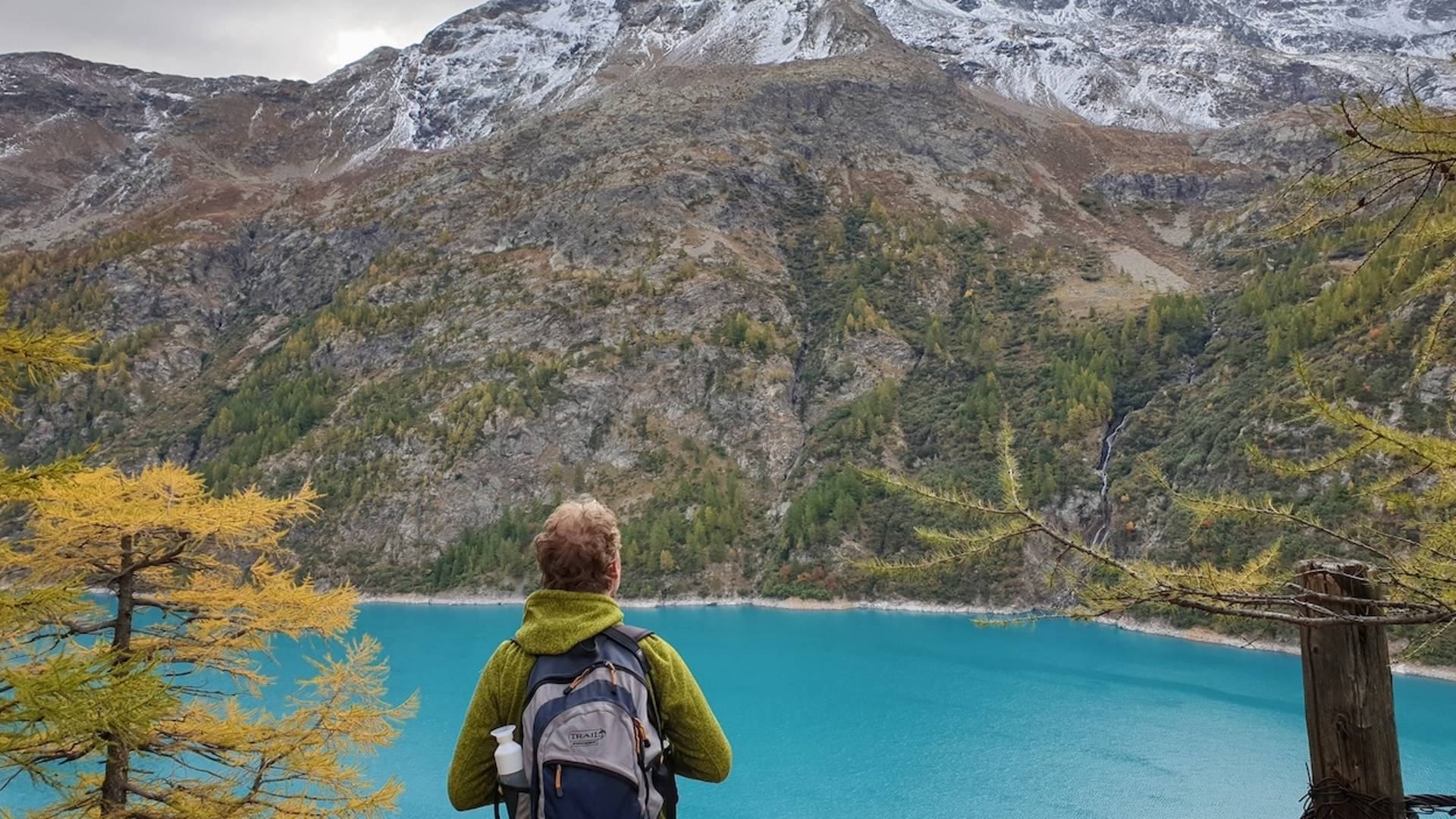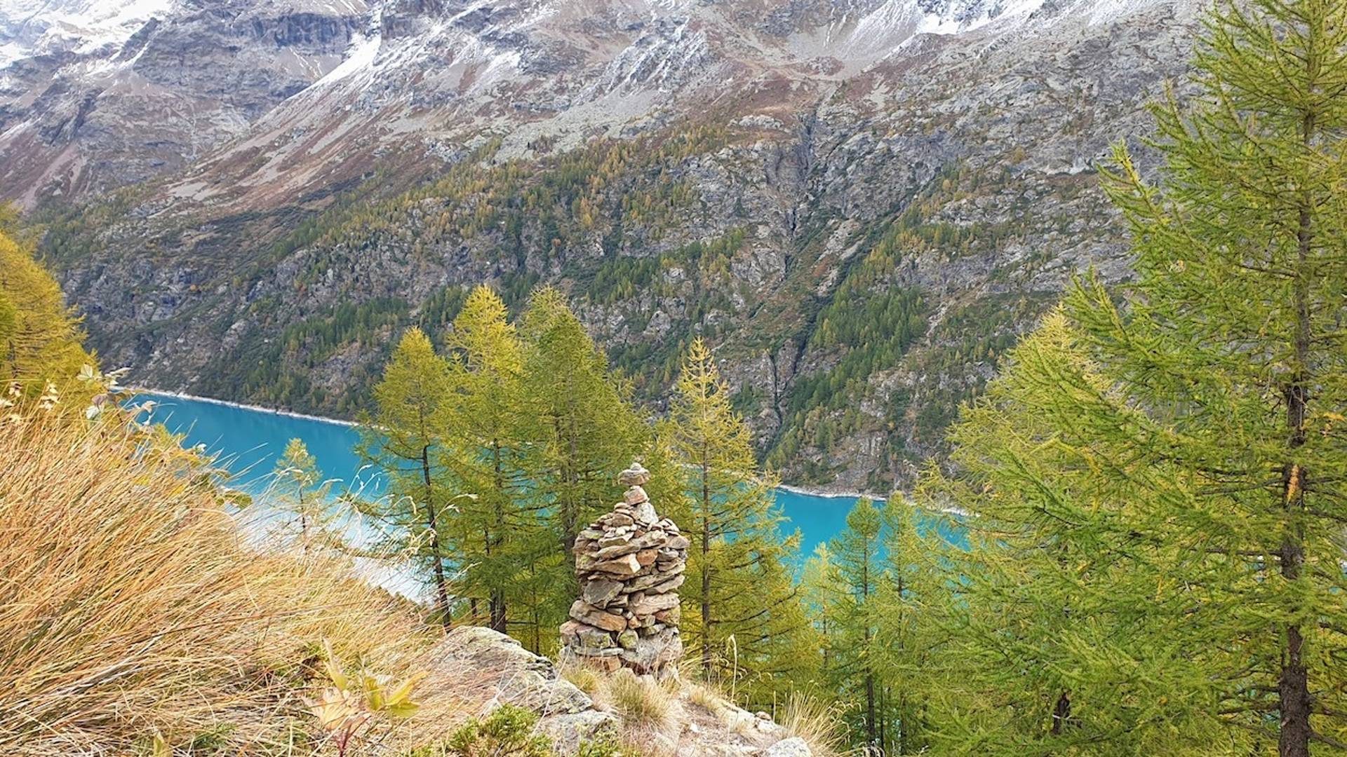 We deden deze hike op een stralende herfstdag, wanneer de goudgele lariksen fel afsteken tegen het aquamarijne water van de stuwdam beneden. De kleuren, het licht en de rust maken deze wandeling op zichzelf al bijzonder — maar het echte spektakel begint pas eenmaal onderweg.
