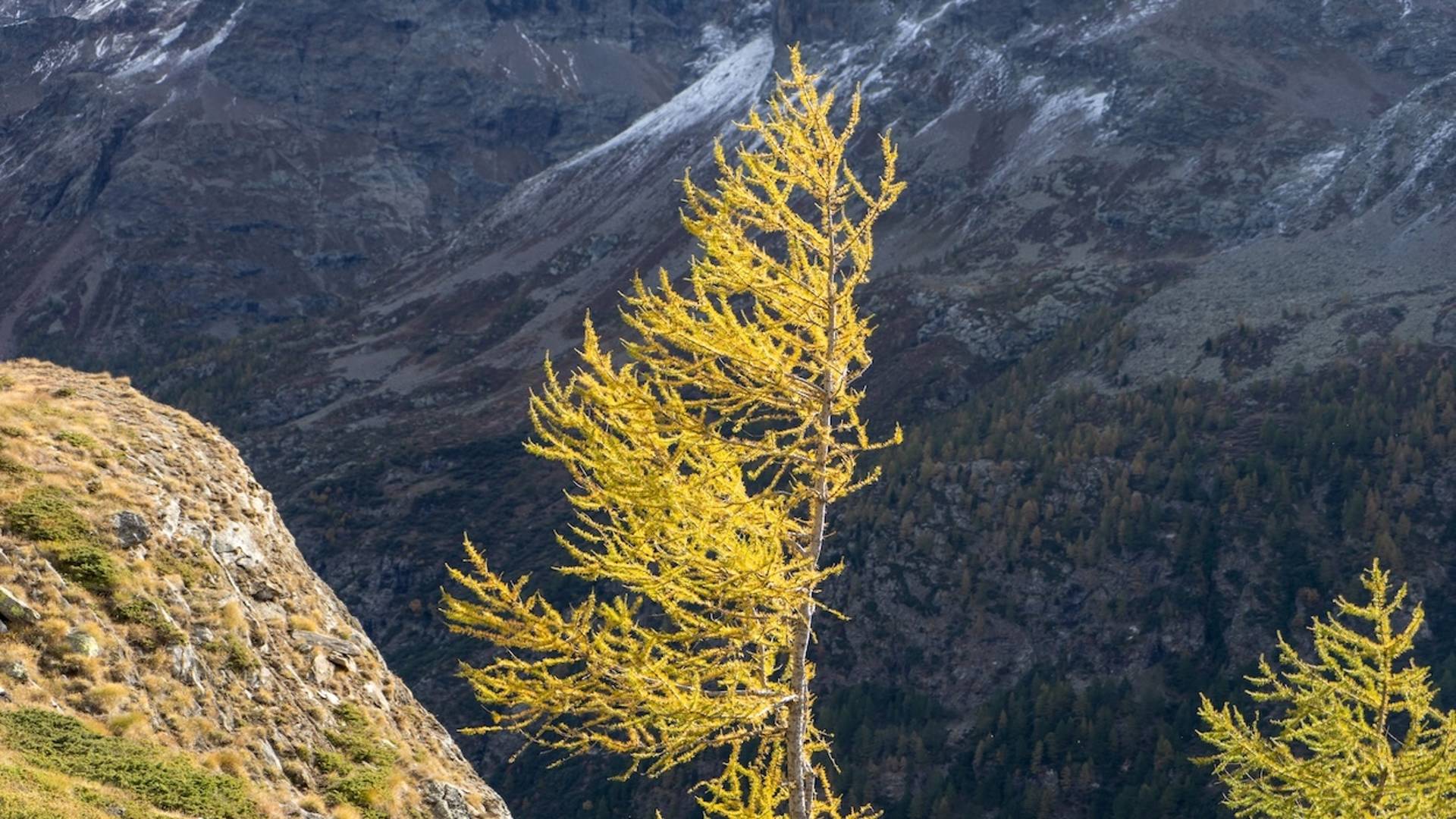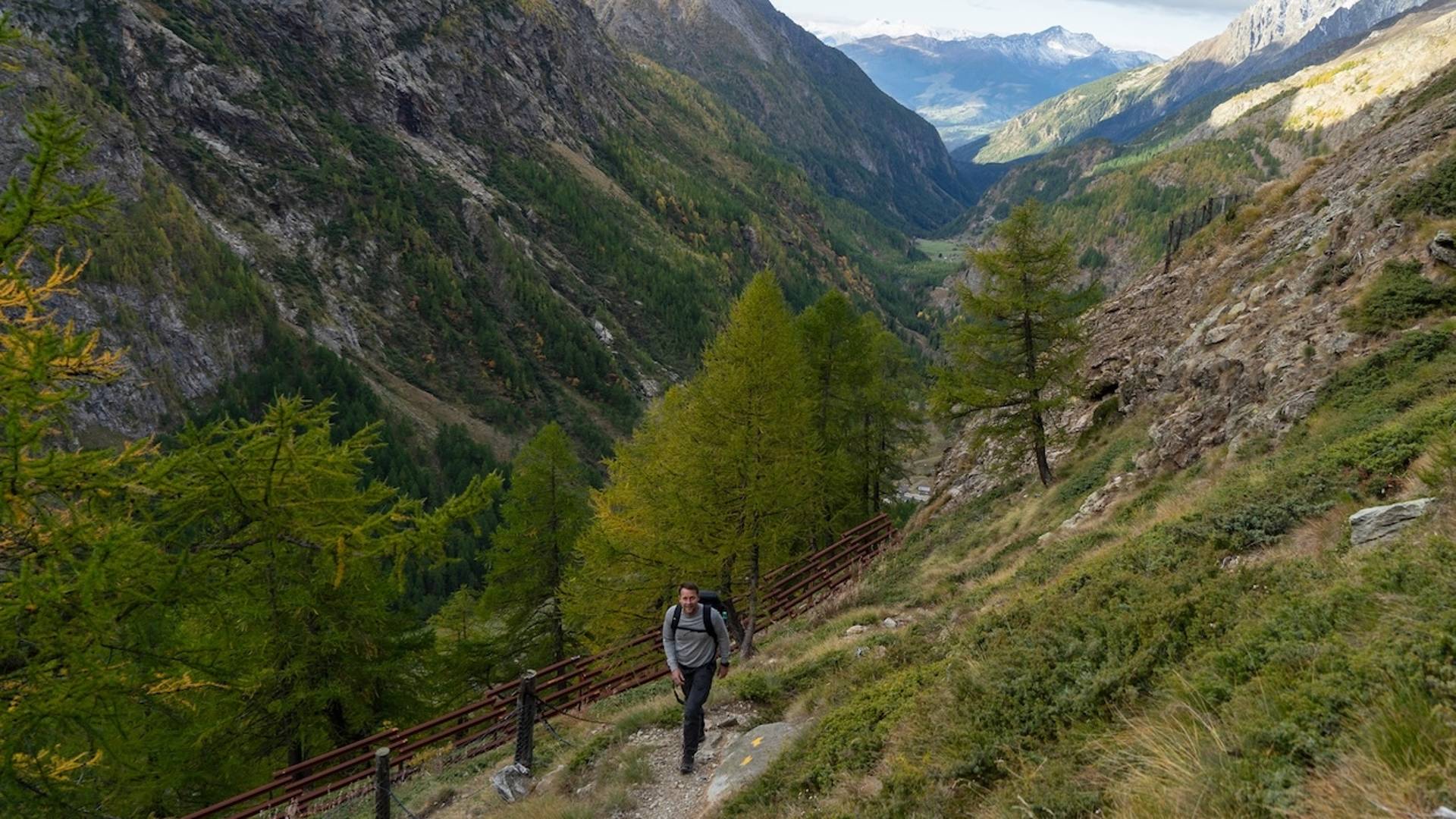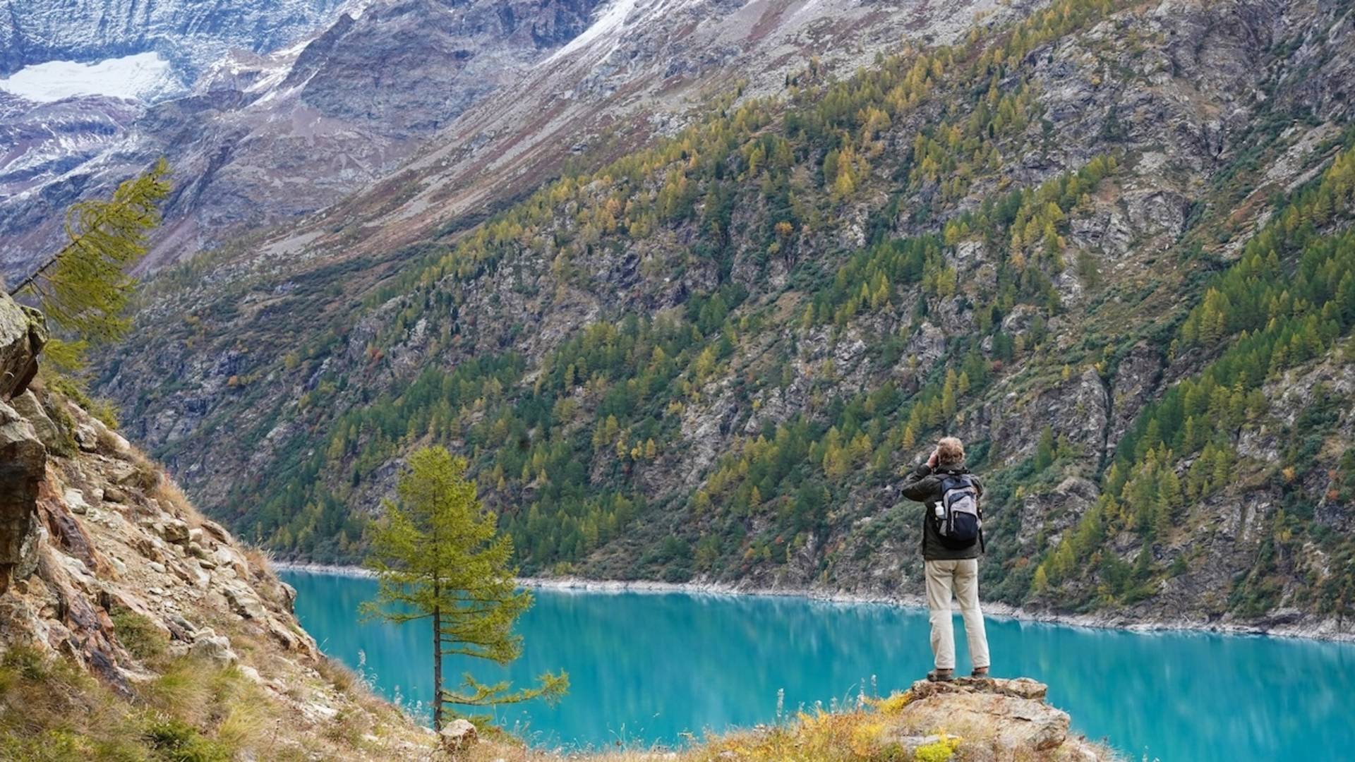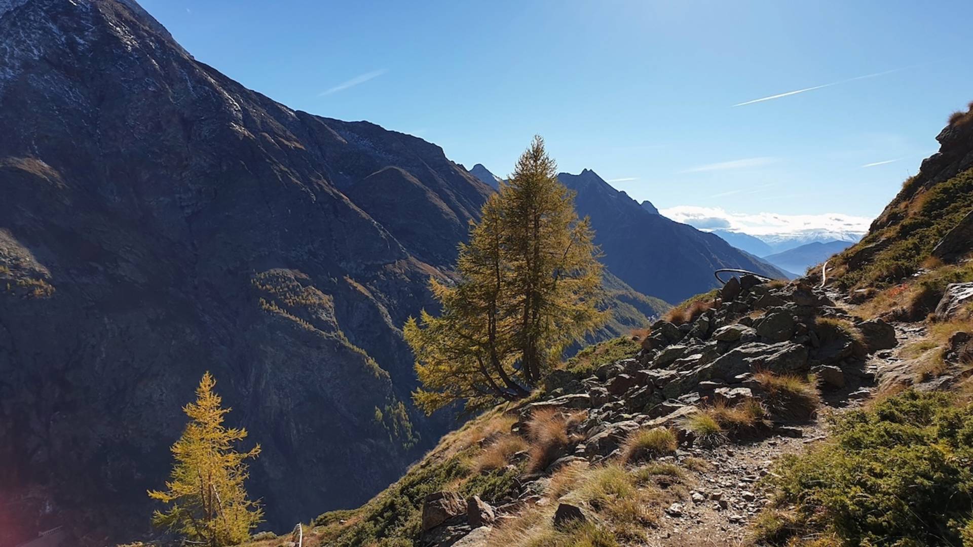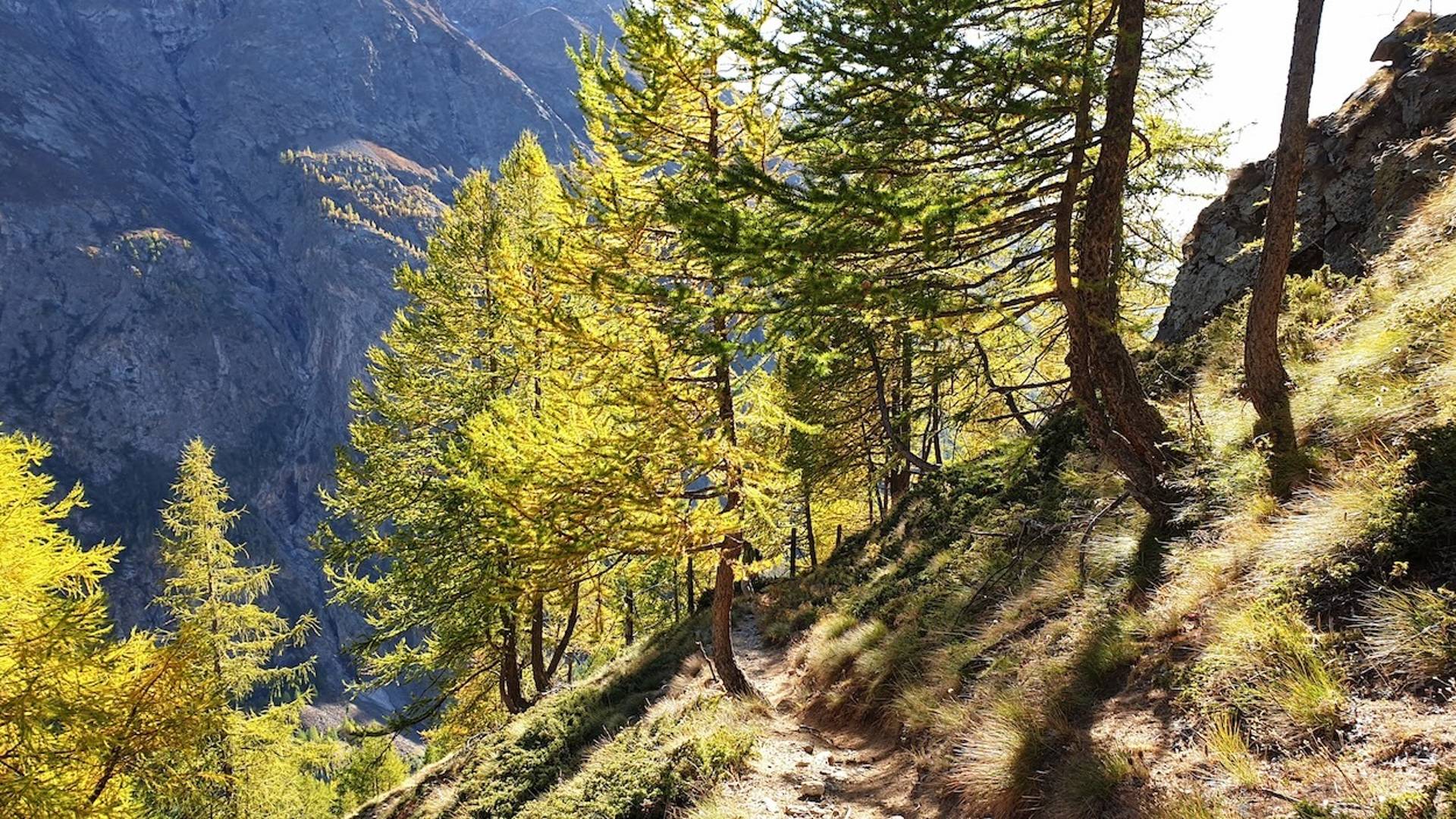 We deden deze hike op een stralende herfstdag, wanneer de goudgele lariksen fel afsteken tegen het aquamarijne water van de stuwdam beneden. De kleuren, het licht en de rust maken deze wandeling op zichzelf al bijzonder — maar het echte spektakel begint pas eenmaal onderweg.