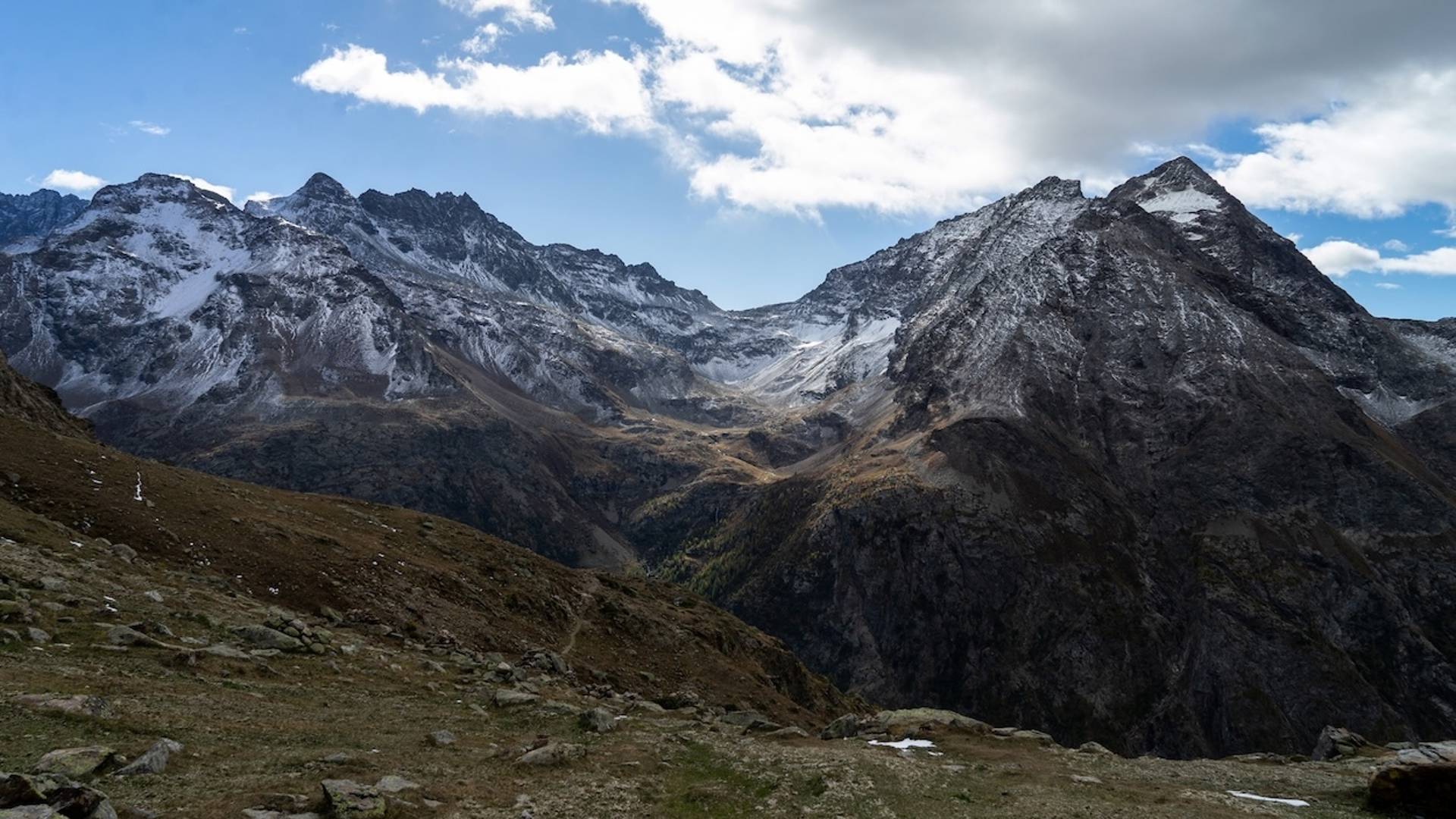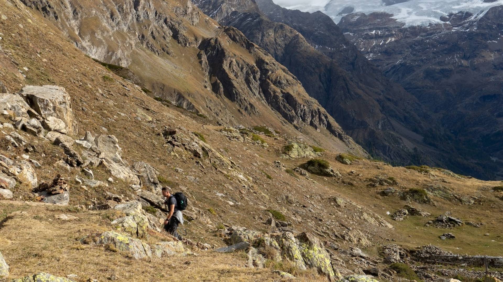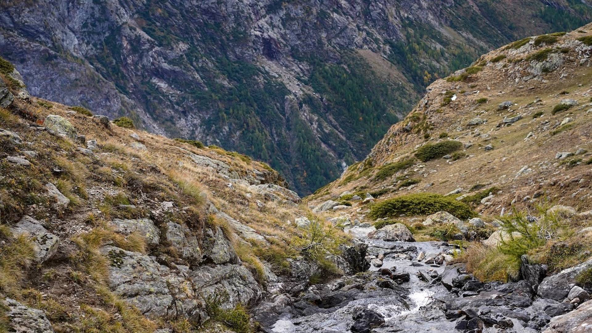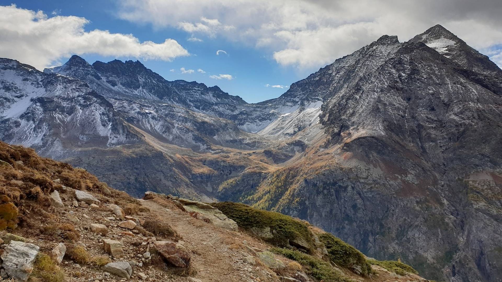 We deden deze hike op een stralende herfstdag, wanneer de goudgele lariksen fel afsteken tegen het aquamarijne water van de stuwdam beneden. De kleuren, het licht en de rust maken deze wandeling op zichzelf al bijzonder — maar het echte spektakel begint pas eenmaal onderweg.