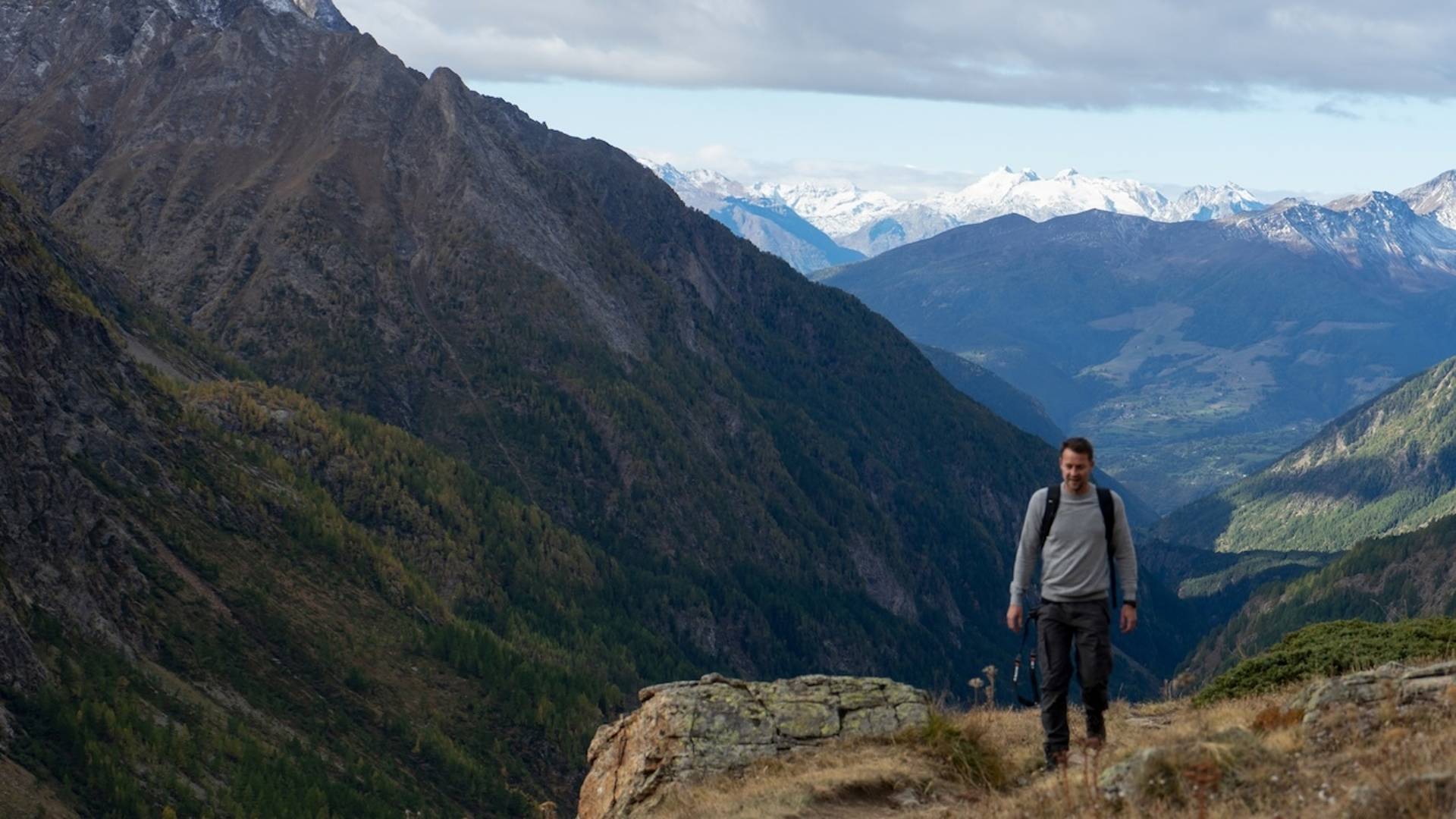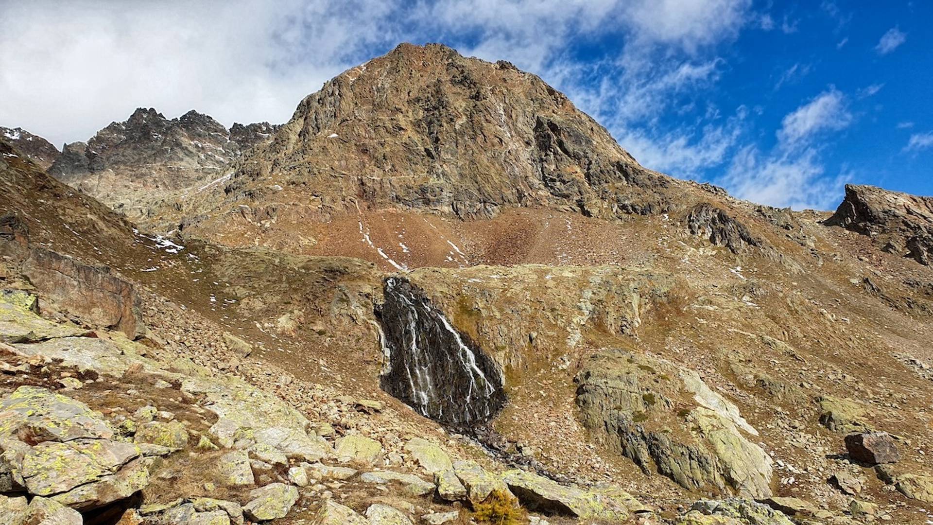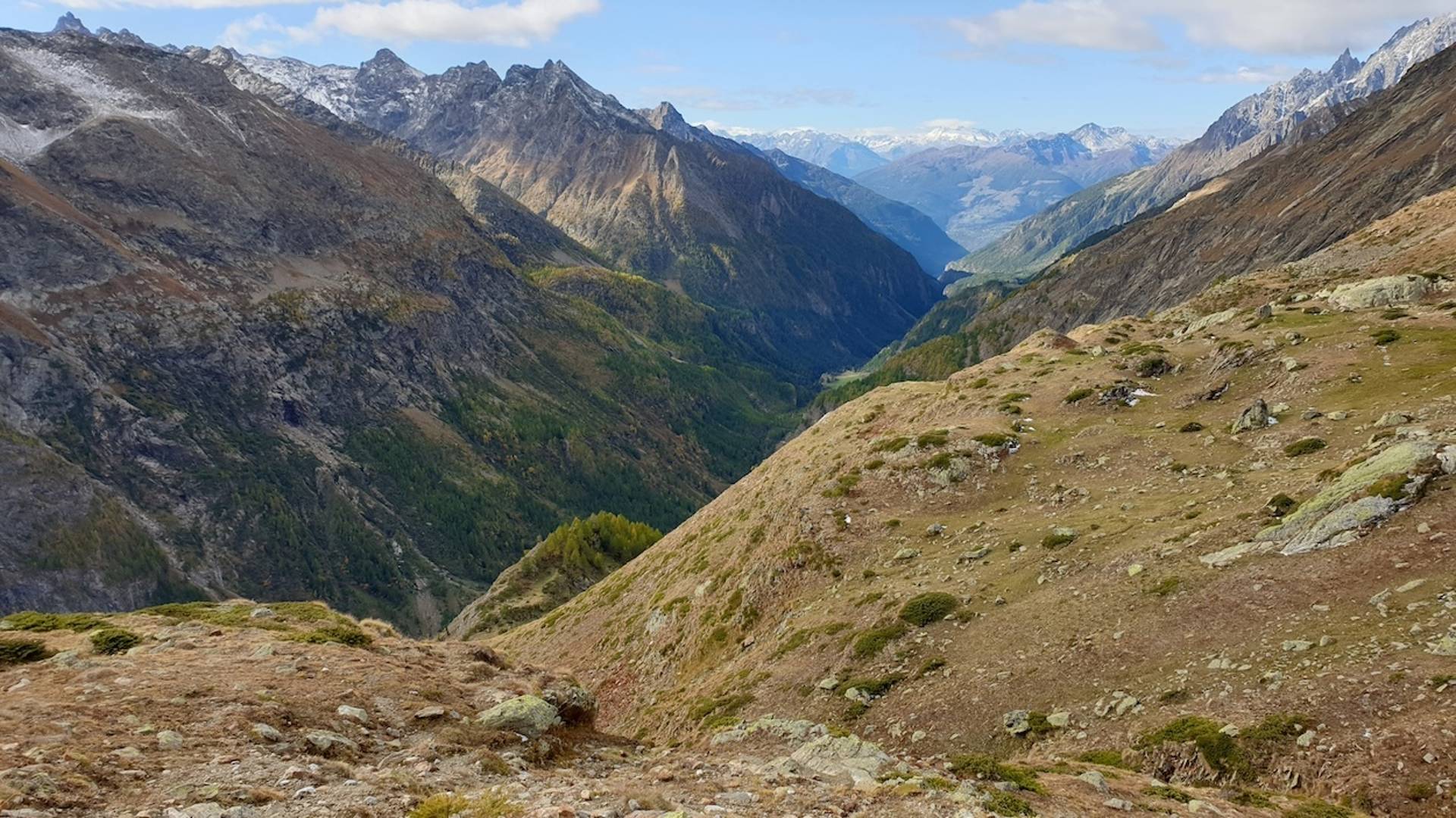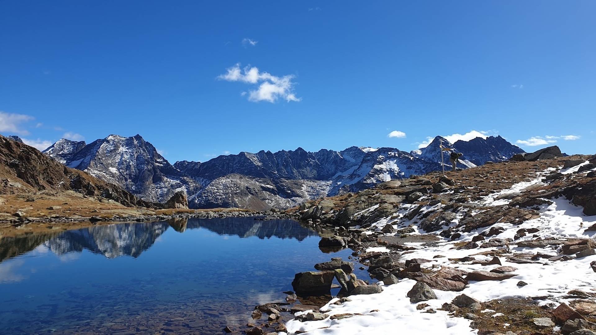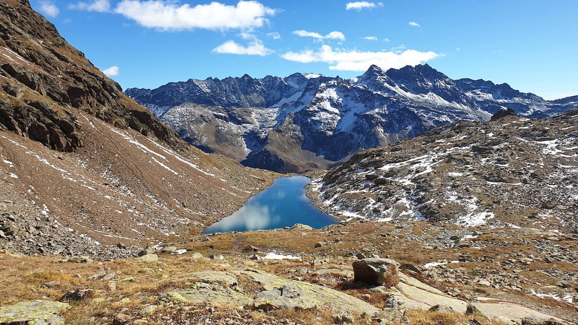 We deden deze hike op een stralende herfstdag, wanneer de goudgele lariksen fel afsteken tegen het aquamarijne water van de stuwdam beneden. De kleuren, het licht en de rust maken deze wandeling op zichzelf al bijzonder — maar het echte spektakel begint pas eenmaal onderweg.