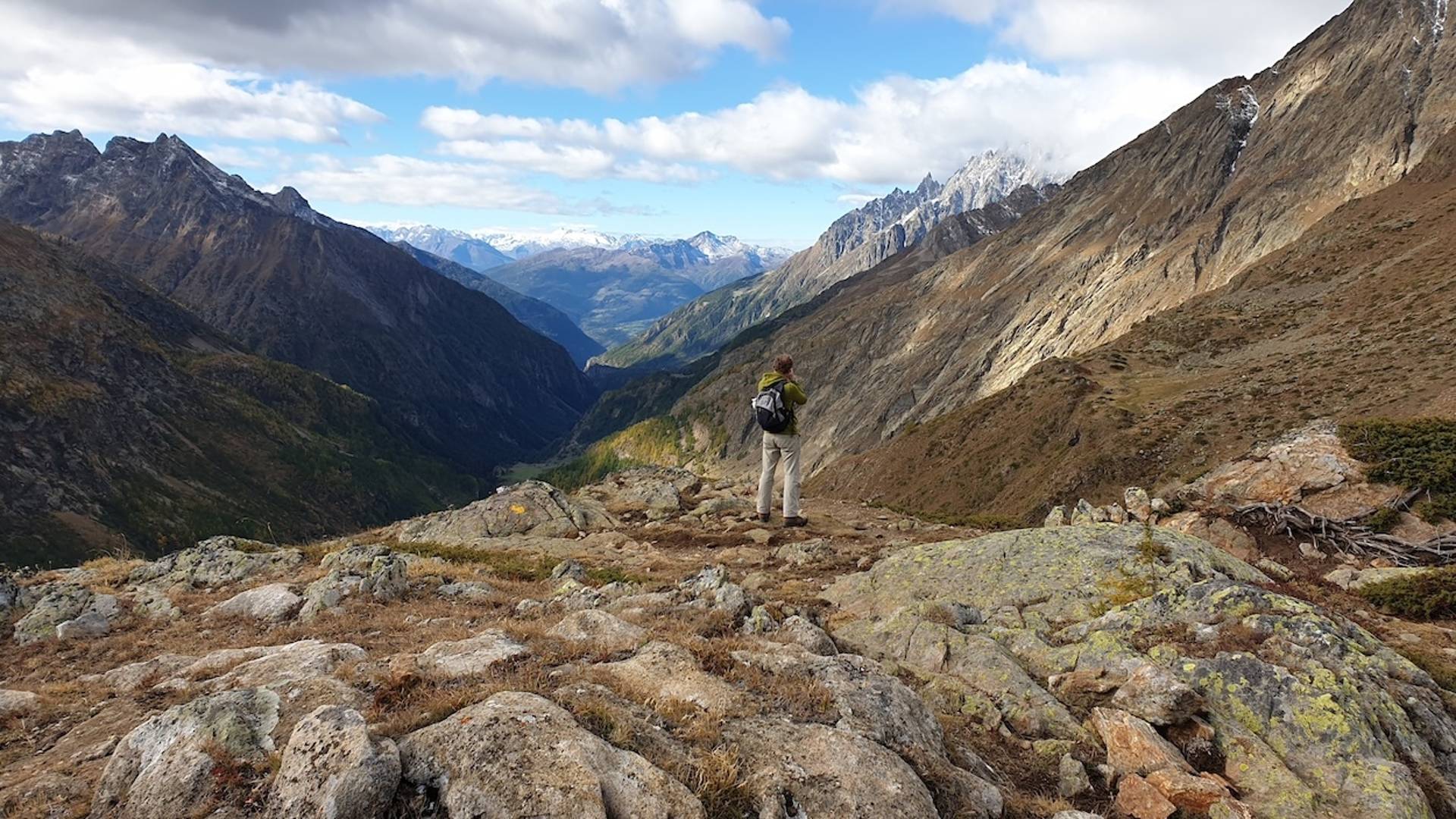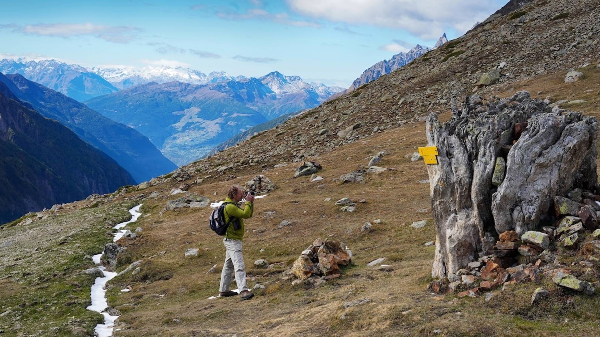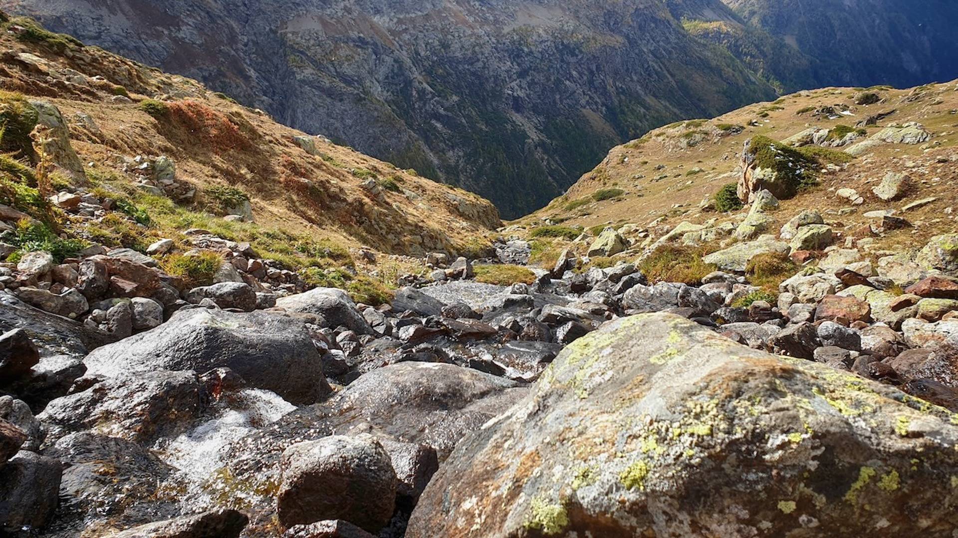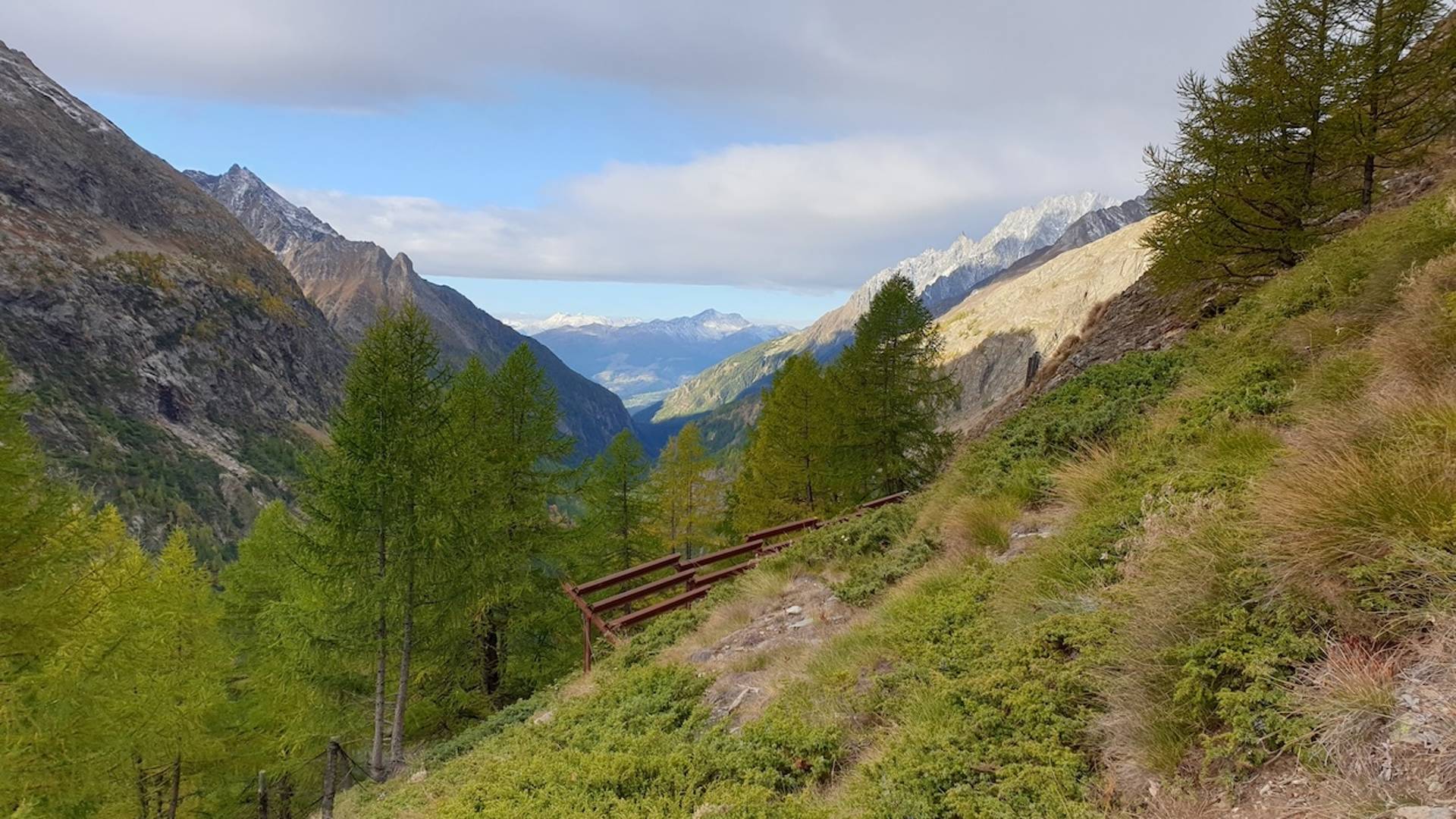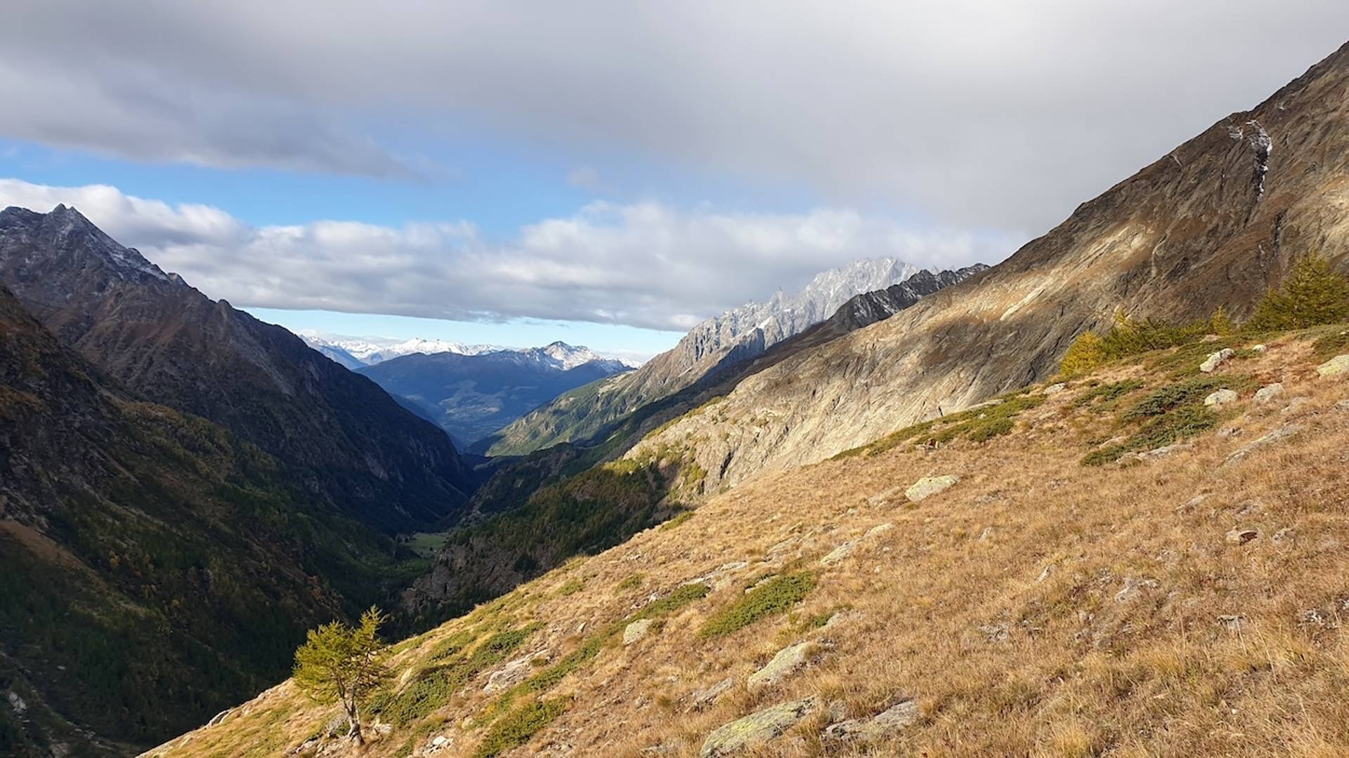 We deden deze hike op een stralende herfstdag, wanneer de goudgele lariksen fel afsteken tegen het aquamarijne water van de stuwdam beneden. De kleuren, het licht en de rust maken deze wandeling op zichzelf al bijzonder — maar het echte spektakel begint pas eenmaal onderweg.