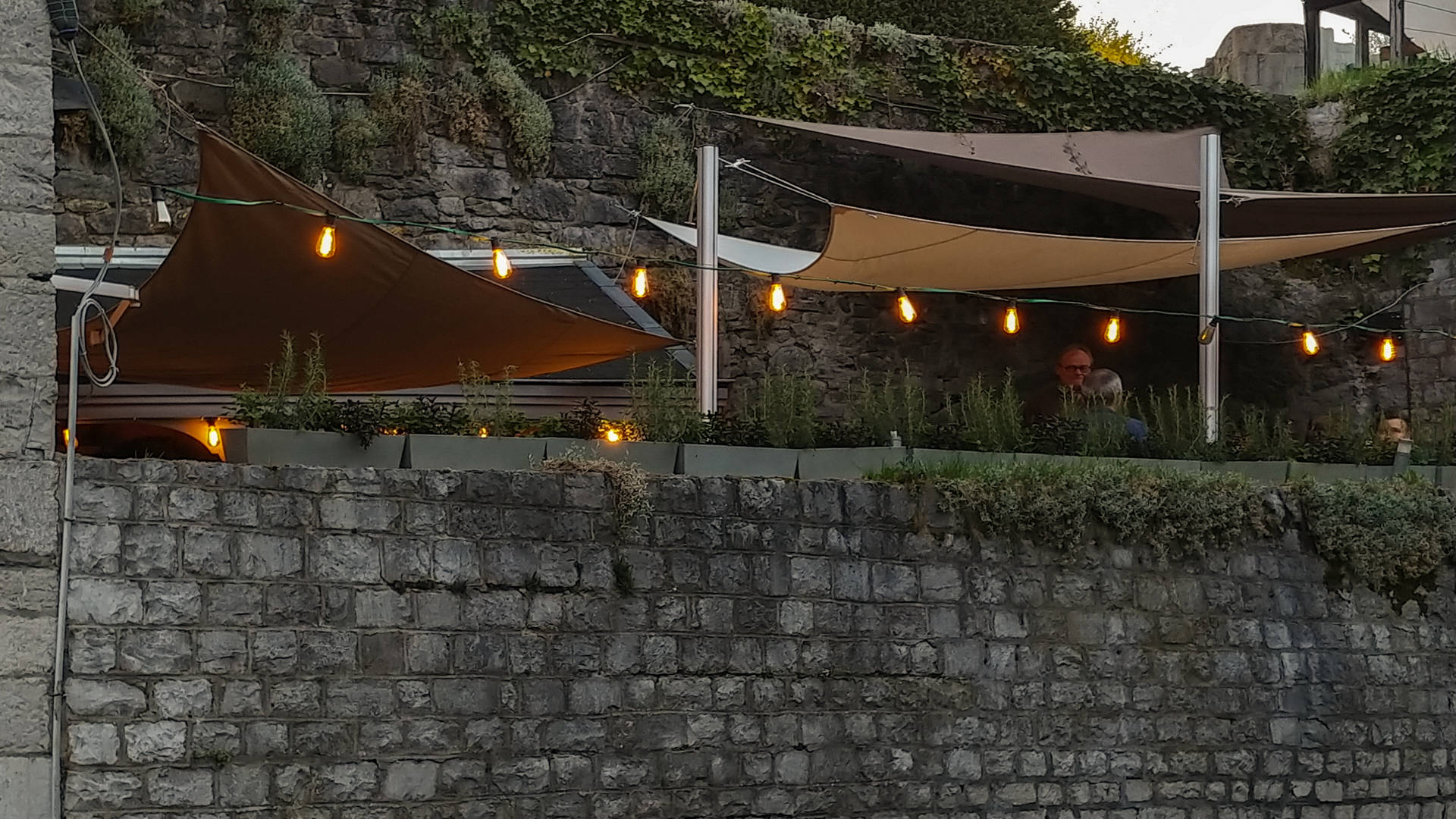 Bij lekker weer gaat het buiten terras open, met uitzicht over de middeleeuwse straatjes van Durbuy. Het terras is een binnenkoertje, dat ooit deel uitmaakte van het kasteel, maar nu eigendom is van het restaurant.
