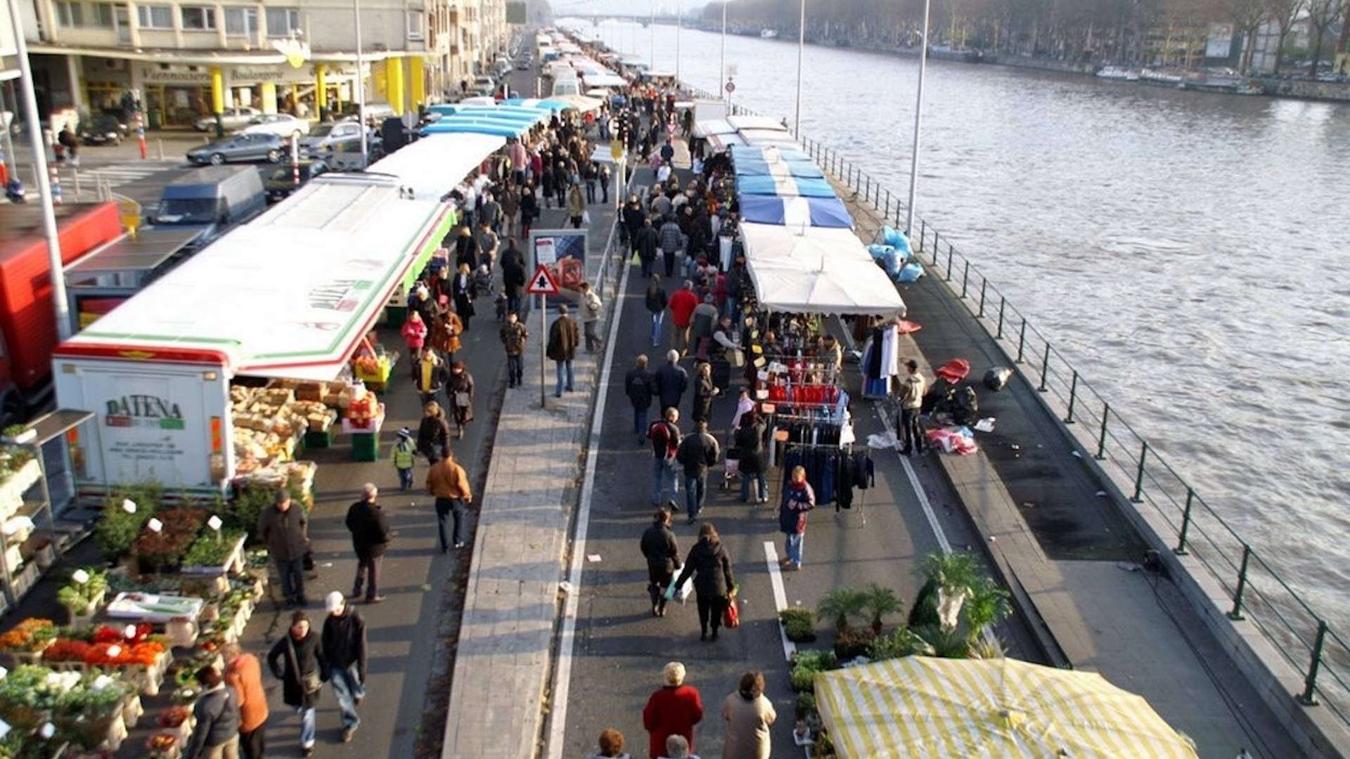 De zondagsmarkt La Batte langs de rivier