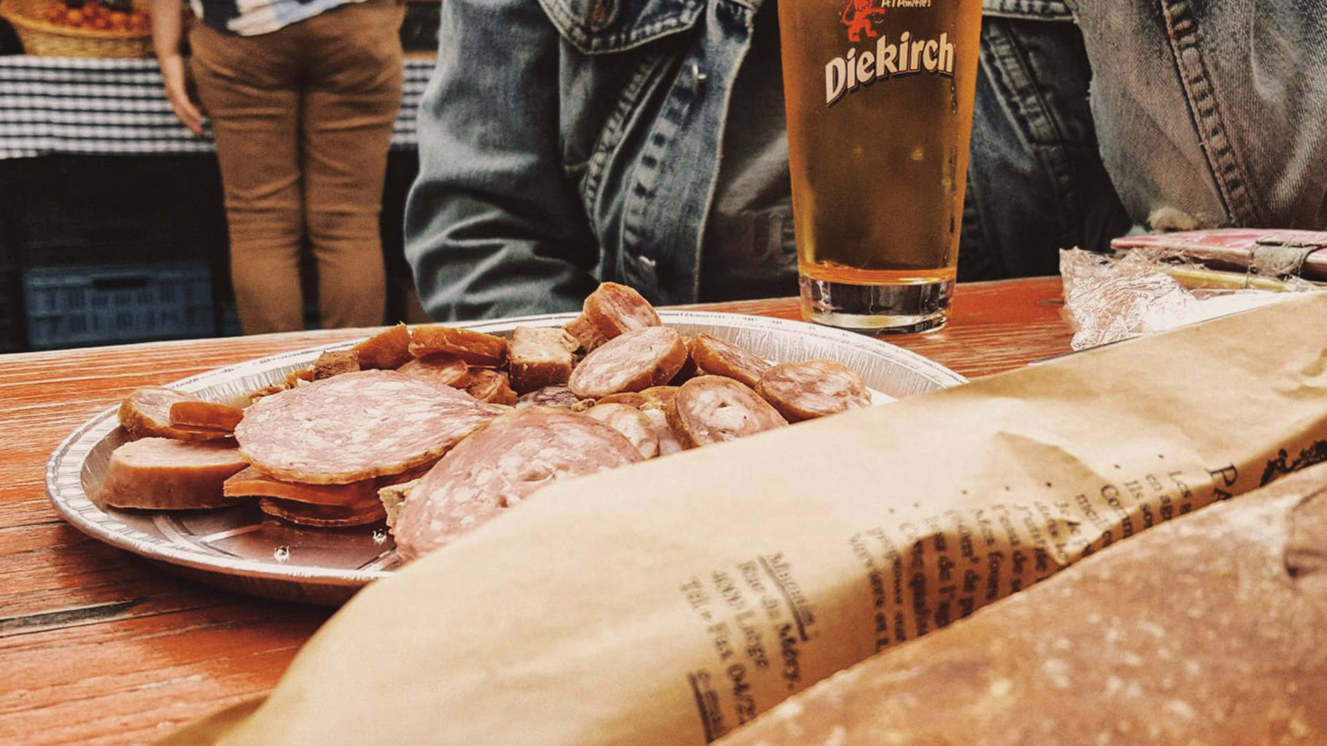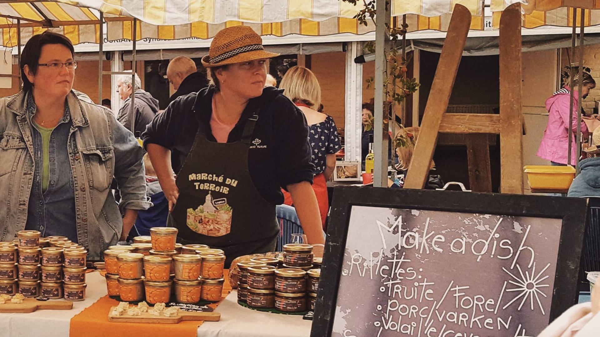 Na het rondstruinen langs de kraampjes kun je neerploffen aan een van de lange picknicktafels. Bestel een Belgisch biertje of een goed glas wijn, geniet van live muziek en proef de warme sfeer. Op zomerse avonden gaat de markt soms tot laat door, onder de bomen of onder een grote tent.