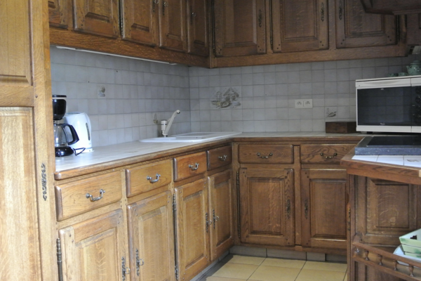 An das Wohnzimmer schließt sich das geräumige Esszimmer an, in dem ein robuster Holzesstisch unter einem authentischen Backsteinbogen steht. Dieser charakteristische Bogen verbindet sich mit der U-förmigen Küche und macht sie zu einem gemütlichen Ort. Die Küche ist komplett ausgestattet - vom Geschirrspüler bis zum Backofen - und ist für gemütliche Momente mit der Familie oder Freunden bestens gerüstet.