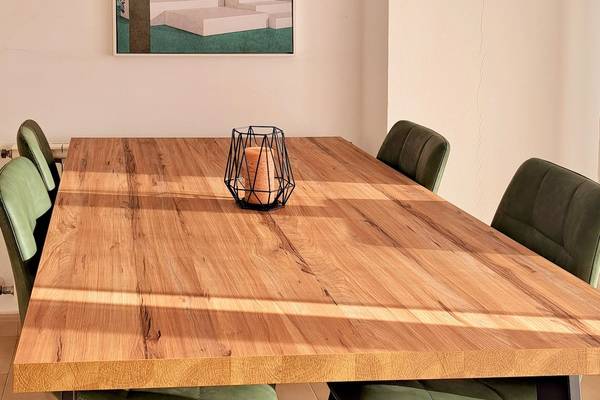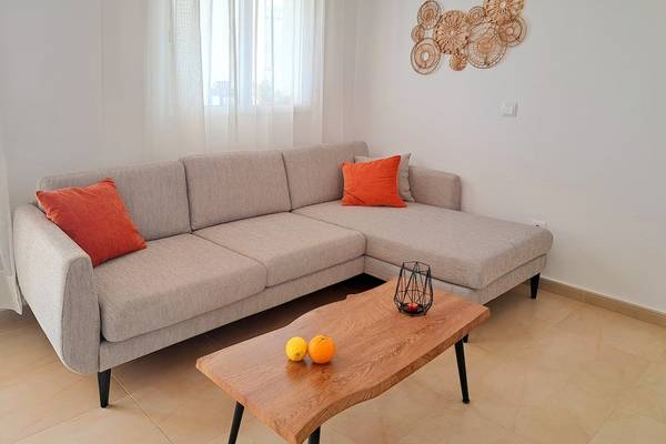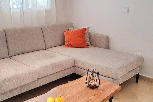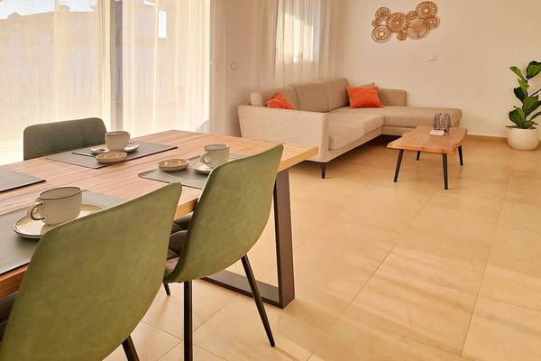 Die Wohnung ist hell, modern und mit Sorgfalt eingerichtet. Durch den Flur gelangen Sie in einen offenen Wohnbereich mit einem einladenden Loungesofa und einem Flachbildfernseher, perfekt für einen entspannten Abend nach einem Tag in der Sonne. Am hölzernen Esstisch können Sie ausgiebig mit Blick auf die Terrasse speisen.