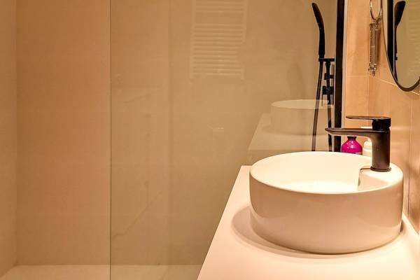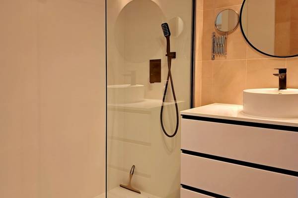 Das Badezimmer ist schlicht und modern eingerichtet und verfügt über eine geräumige begehbare Dusche mit Regen- und Handbrause, ein Waschbecken mit Schubladen und eine Toilette.