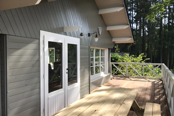 Der Garten ist komplett eingezäunt und hundefreundlich, so dass Ihr vierbeiniger Freund sich frei bewegen kann. Ein kleines Tor auf der Rückseite führt Sie direkt in den Wald für einen morgendlichen Spaziergang. Auf der 80 m² großen Terrasse können Sie lange Sommertage am Picknicktisch genießen, Fleisch oder Gemüse auf dem steinernen Holzkohlegrill zubereiten oder Schatten unter dem überdachten Bereich mit bequemen Liegestühlen suchen.