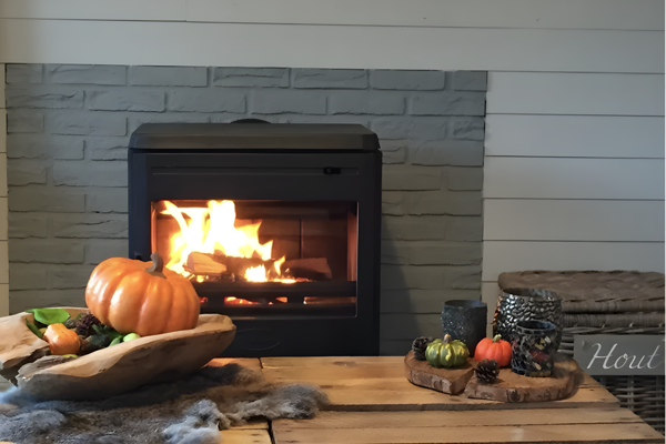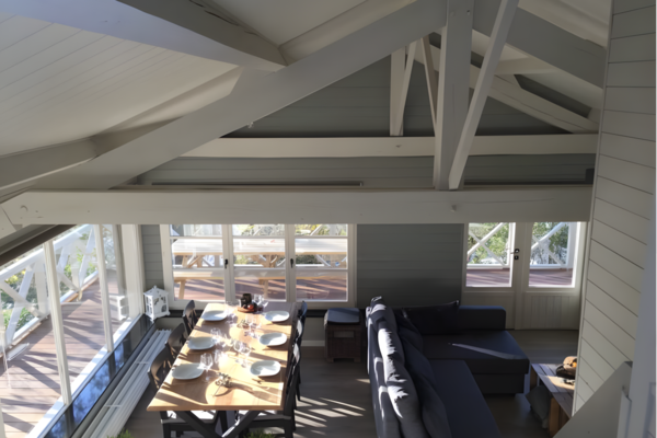 Über den Weg durch den Garten gelangt man auf die Terrasse und betritt einen warmen Lebensraum, in dem man sich sofort geborgen fühlt. Das Herzstück des Raums ist ein robuster Eichenstammtisch, an dem sechs Personen essen und Spiele spielen können. Am Abend können Sie es sich in der Sitzecke um den knisternden Dovre-Holzofen, auf dem Loungesofa oder in den Rattansesseln gemütlich machen, während im Hintergrund der Fernseher leise spielt.