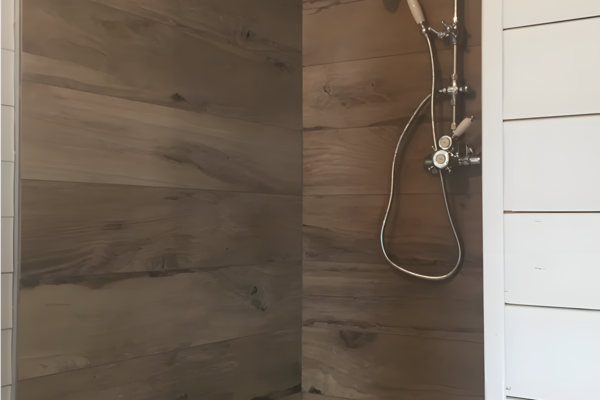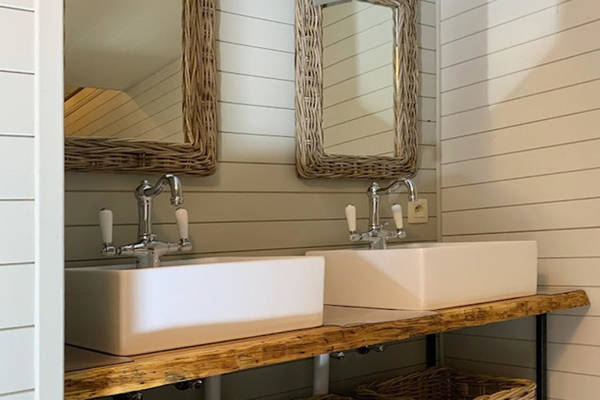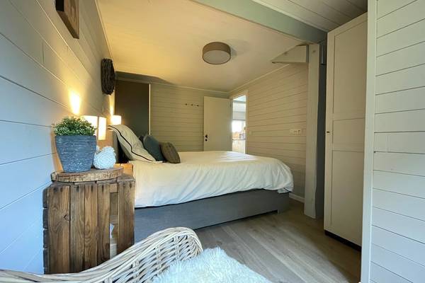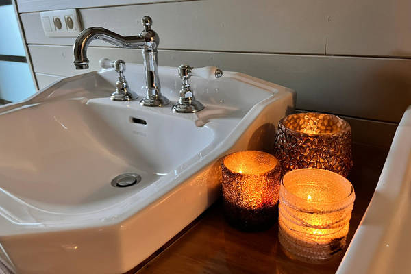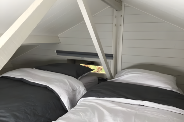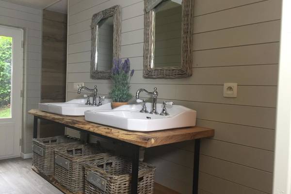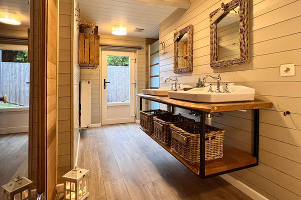 Zwei Schlafzimmer befinden sich ebenfalls im Erdgeschoss. Das erste Zimmer verfügt über ein bequemes Doppel-Boxspringbett und einen geräumigen Kleiderschrank, der Platz für ein Babybett bietet. Das zweite Zimmer hat zwei Einzelbetten, ideal für Kinder oder Freunde. Das Badezimmer ist mit dem stabilen Baumstammschrank und dem Doppelwaschbecken wie ein kleiner Wellnessbereich. Die begehbare Dusche und die Toilette vervollständigen es.