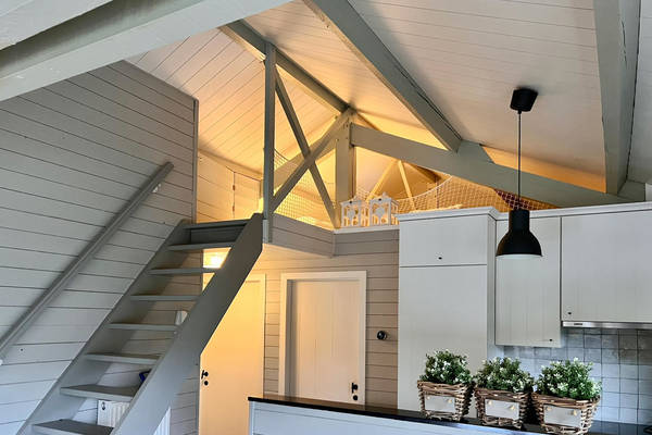 Eine Treppe führt in das Zwischengeschoss. Unter der Dachschräge befindet sich ein gemütlicher Schlafbereich mit begrenzter Höhe - eine echte Spiel- und Schlafecke, in der sich Kinder wohlfühlen.