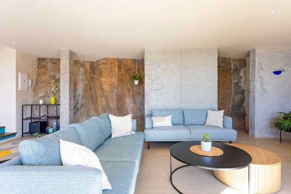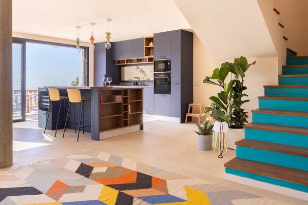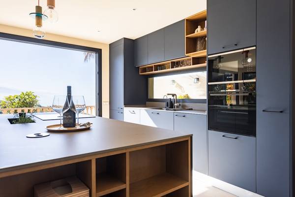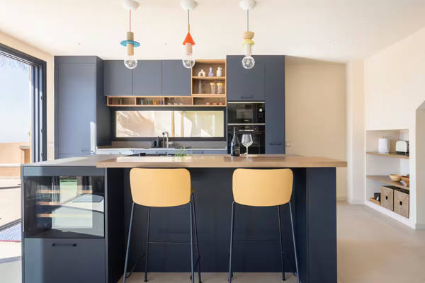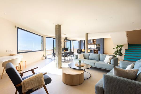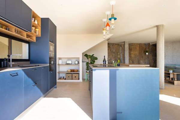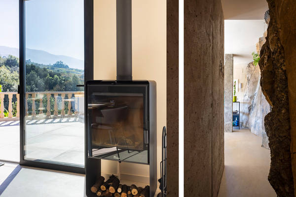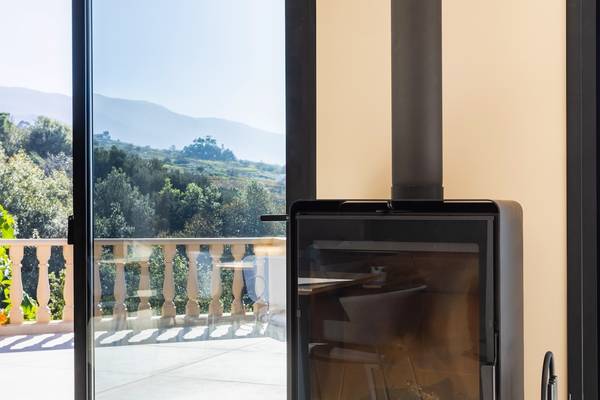 Im Inneren betritt man einen hellen, offen gestalteten Wohnraum, in dem ein großes Panoramafenster die Aussicht wie ein lebendiges Gemälde einrahmt. Das bequeme Loungesofa und der Sessel laden zu entspannten Abenden ein, während der charmante Kamin auf der Terrassenseite an kühleren Tagen Wärme spendet. In der Mitte des Raumes steht ein stilvoller Esstisch, der sich perfekt für lange Abendessen oder ruhige Morgenstunden mit einer Tasse Kaffee eignet. Die offene Küche mit Kochinsel ist komplett ausgestattet mit Induktionskochfeld, Backofen, Mikrowelle, großem Kühlschrank mit separatem Gefrierfach und Geschirrspüler. Während des Kochens können Sie es sich an der Bar mit einem Glas Wein aus der Region gemütlich machen.