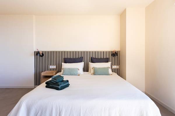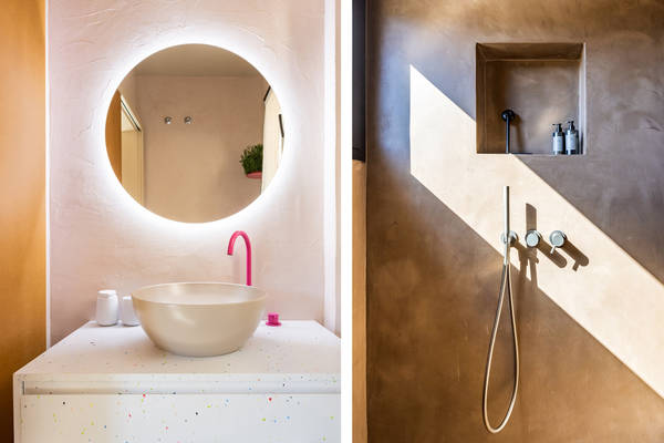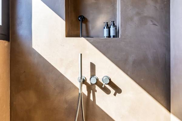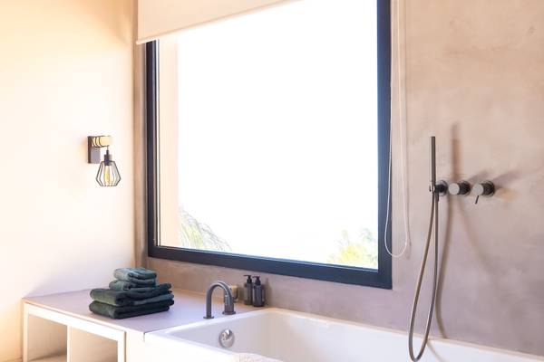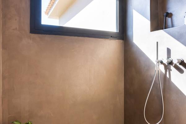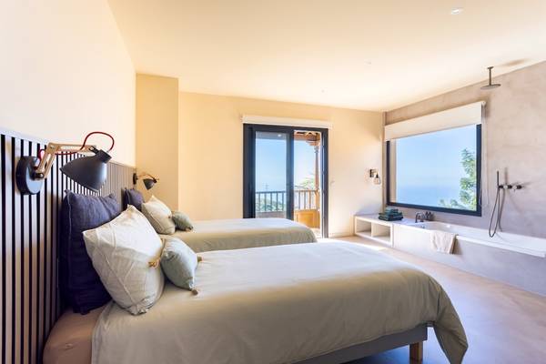 Im ersten Stock befinden sich zwei geräumige Schlafzimmer mit bequemen Kingsize-Betten (180 x 90 cm, auch einzeln erhältlich). Das Hauptschlafzimmer verfügt über ein offenes Bad mit Panoramablick - ein seltener Moment von Luxus und Ruhe. Das zweite Schlafzimmer verfügt über einen eigenen Schreibtisch und Zugang zu einem charmanten Holzbalkon mit Blick auf die Umgebung. Beide Bäder sind mit Betonstuckdetails, Regendusche, Waschbecken und Toilette ausgestattet.