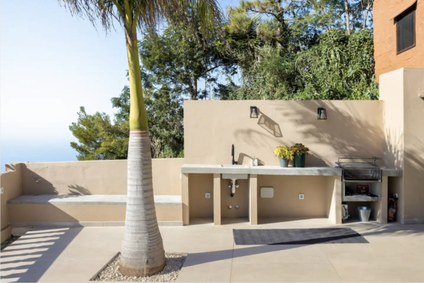 Mehrere Terrassen umgeben die Villa, jede mit ihrem eigenen Ambiente und Ausblick. Eine große Sonnenterrasse mit Außenküche, Barbecue und Gasgrill erstreckt sich auf der Wohnebene. Hier können Sie lange Abende unter dem Sternenhimmel genießen, umgeben von sanften Tönen, natürlichen Materialien und dem Rauschen des Meeres im Hintergrund. Sonnenliegen, Hängematten und ein geräumiger Essbereich machen diese Terrasse zu einem schönen Ort zum Faulenzen oder Essen im Freien.