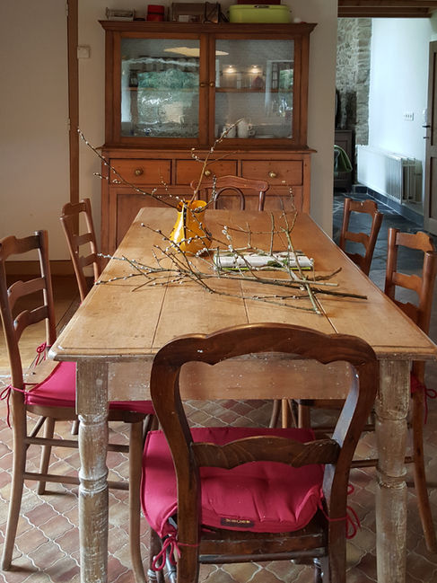 Upon entering, your eye is immediately drawn to the natural stone floor, which perfectly complements the authentic character of the house. From here, you have access to the cozy living areas downstairs. An open wooden staircase leads to the upper floor, where the bedrooms and bathroom are located.