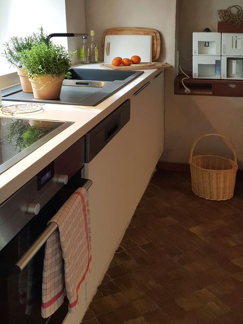 The kitchen combines modern convenience with a touch of nostalgia. The sleek, modern white kitchen unit offers all essential amenities, including a convection oven, ceramic cooktop, and a dishwasher for maximum comfort. Opposite the kitchen unit stands a charming wooden dining table, inviting you to enjoy long, cozy meals. A beautiful buffet cabinet adds extra character to the space, completing the kitchen as a place where old and new come together.