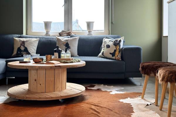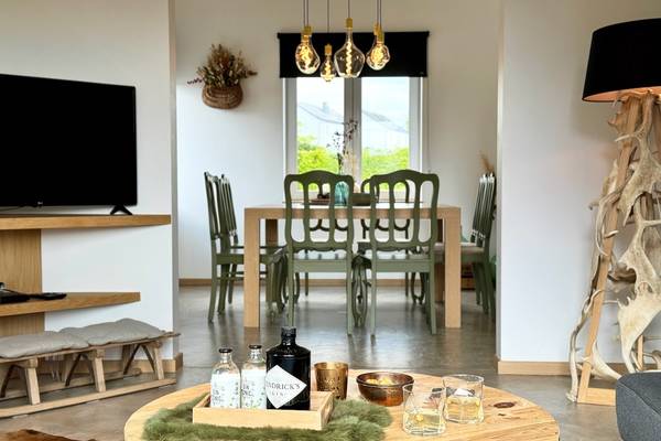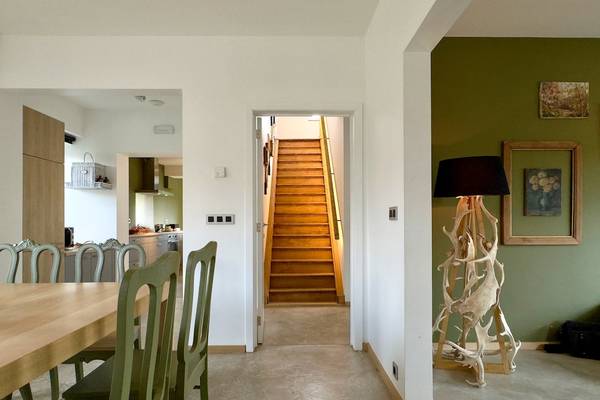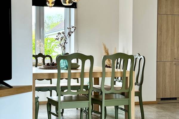Le salon accueillant vous invite à vous détendre sur le canapé confortable, tandis que des tableaux de cerfs attachants et une grande horloge en bois donnent à la pièce une atmosphère chaleureuse, presque féerique. La grande télévision à écran plat complète l'ensemble pour une soirée cinéma confortable. Le salon donne sur la salle à manger, où une table en bois robuste est entourée de chaises vertes et douces. De belles lampes soufflées à la main sont suspendues au-dessus de la table, et le mot "SMILE" apparaît en grandes lettres sur le mur - un clin d'œil du propriétaire hospitalier.