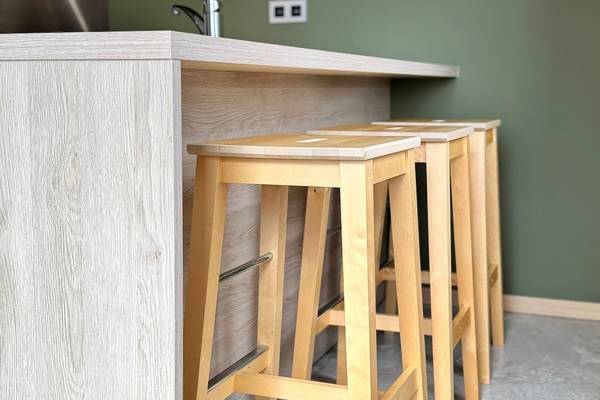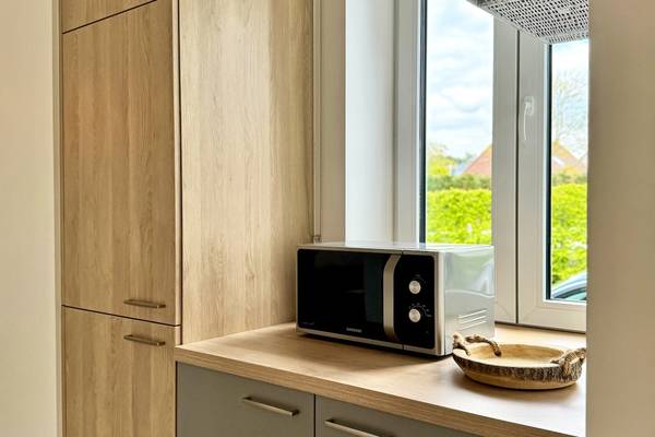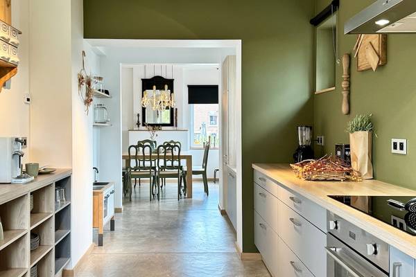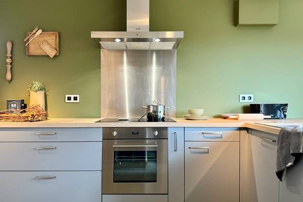 À côté se trouve la cuisine entièrement équipée, avec un îlot de cuisson en forme de L où vous pouvez vous asseoir confortablement tout en cuisinant. La cuisine est équipée d'appareils modernes tels qu'une plaque à induction (60 cm), un four, un lave-vaisselle, un réfrigérateur avec congélateur, une bouilloire et une cafetière. Tout ce dont vous avez besoin pour cuisiner ensemble ou pour préparer un bon petit déjeuner.
