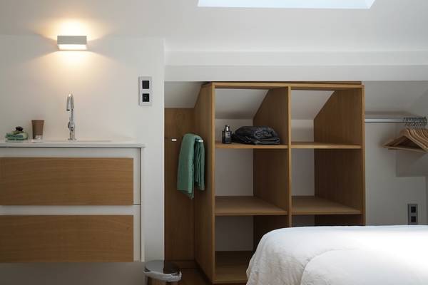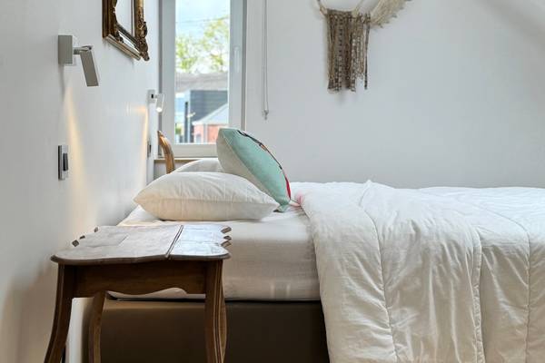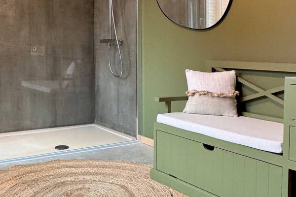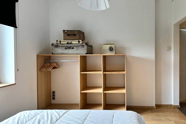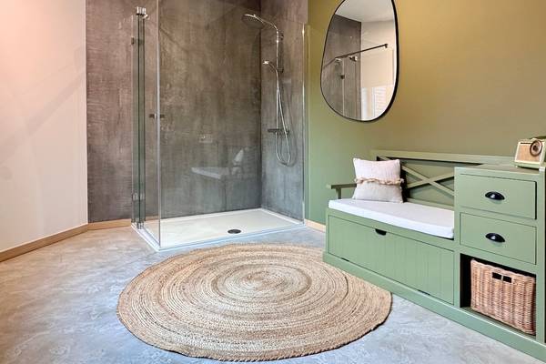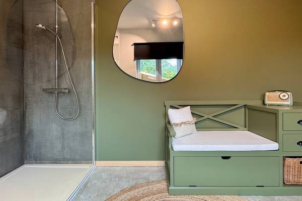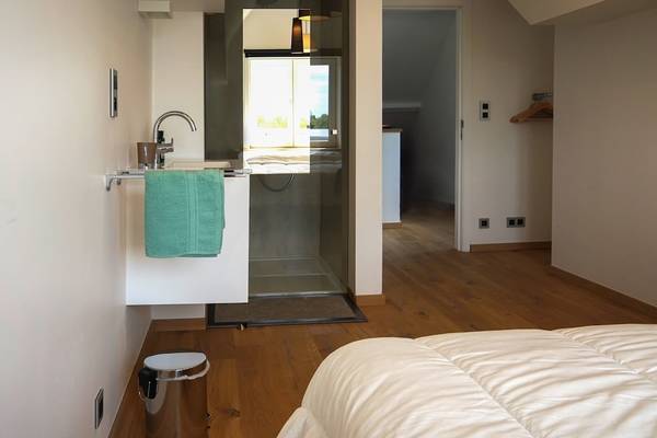 Au rez-de-chaussée, vous trouverez également la première chambre spacieuse, immédiatement à votre droite en entrant. Vous pourrez y dormir confortablement sur un sommier double (160 cm). Cette chambre dispose d'une salle de bain privée avec douche à l'italienne et lavabo - parfaite pour ceux qui ne veulent pas monter les escaliers ou qui souhaitent un peu plus d'intimité. Les toilettes pour les invités se trouvent également à cet étage, dans le couloir.