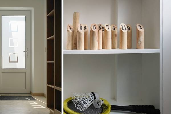 Pour ceux qui viennent en voiture : il y a un grand parking devant la maison, avec de la place pour trois véhicules. À l'intérieur, il y a également un espace de rangement pratique en face de la cuisine, où vous trouverez des coussins pour le salon, des chaises longues et des jeux de plein air.