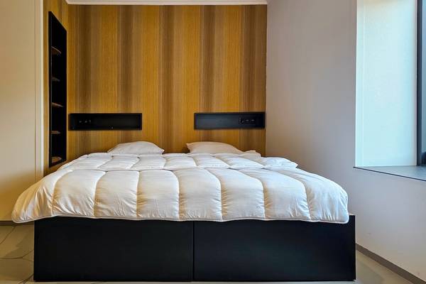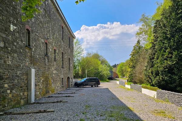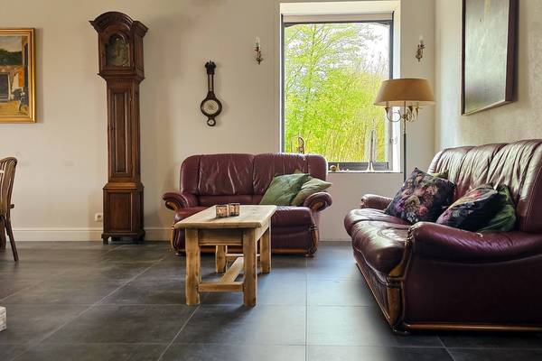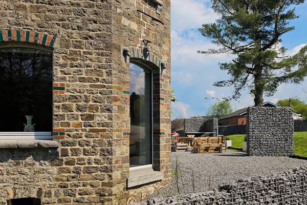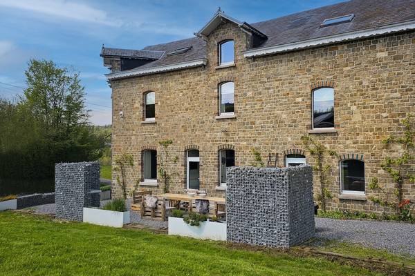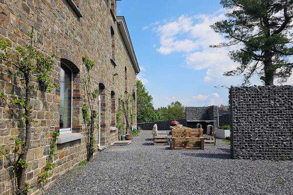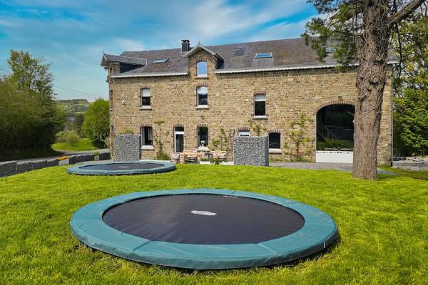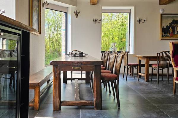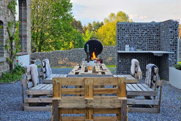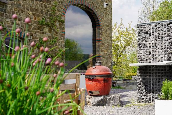 À l'avant de la maison se trouve une terrasse ensoleillée avec cuisine extérieure. Les piliers en pierre des Ardennes intègrent des plans de travail et la terrasse abrite un grand salon en bois d'échafaudage et un barbecue XL Egg - idéal pour les longues soirées d'été. Sur la pelouse devant la maison, les enfants peuvent s'amuser sur deux trampolines géants.