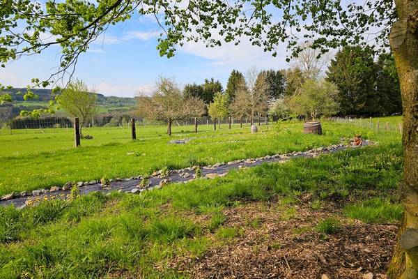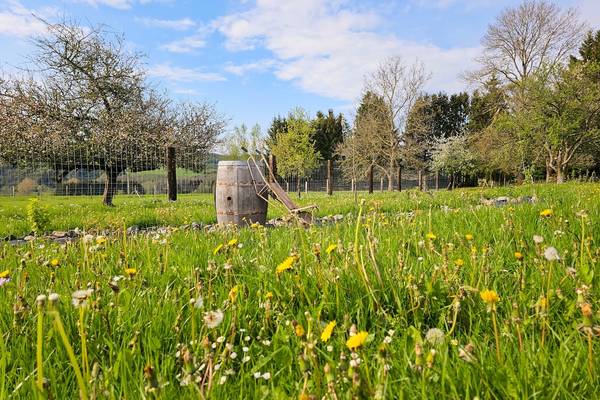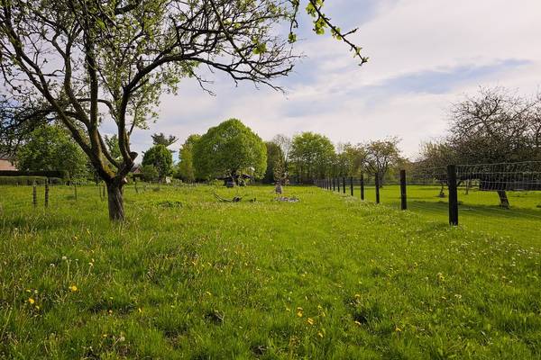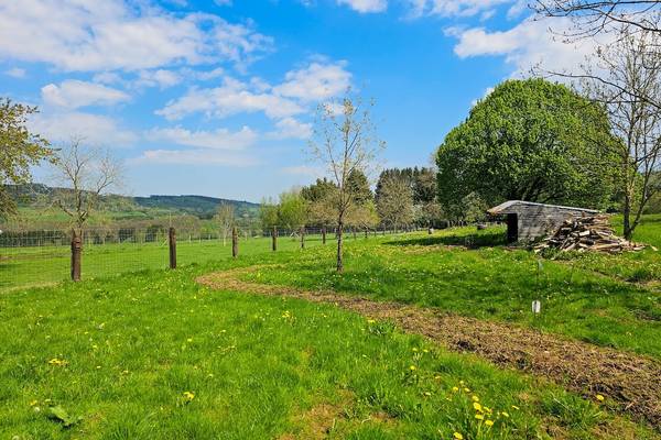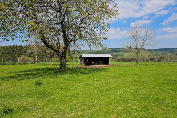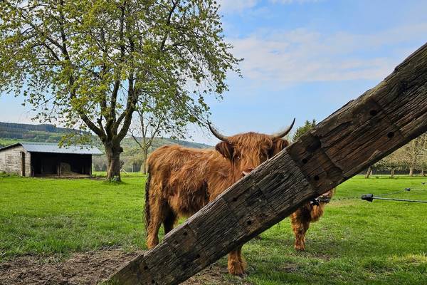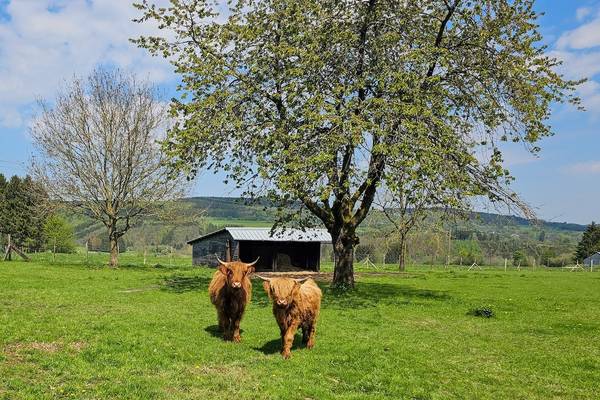 À l'arrière, vous avez une vue sur les terres agricoles, où deux Highlanders écossais paissent paisiblement. Il y a une forêt nourricière et un grand terrain de jeu pour les jeunes et les moins jeunes. Vous y trouverez également de nombreuses places de parking, y compris deux bornes de recharge pour les voitures électriques.