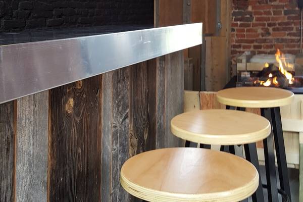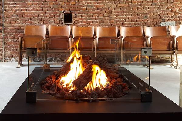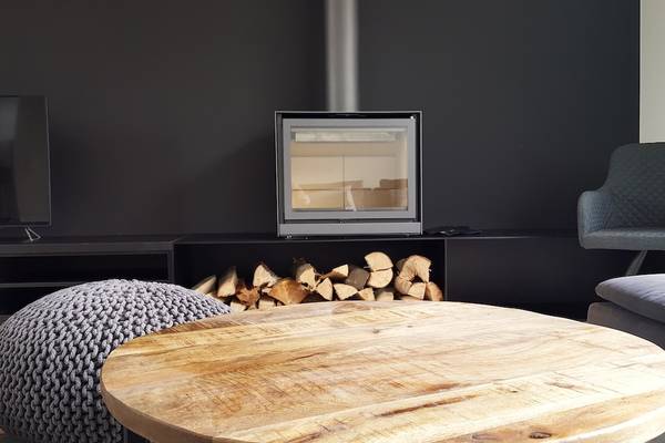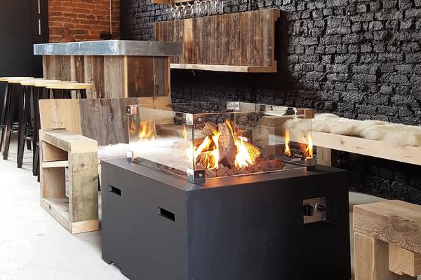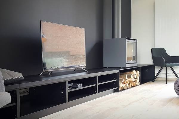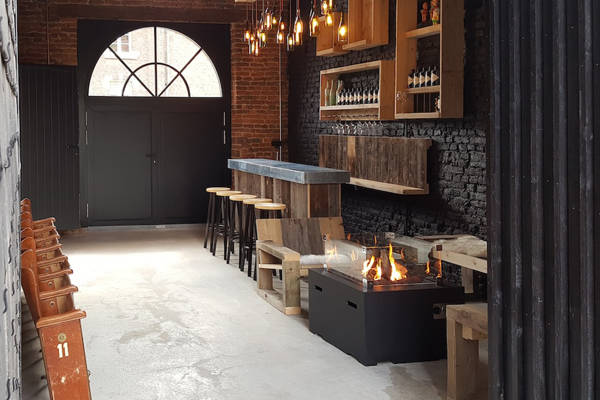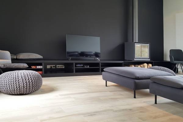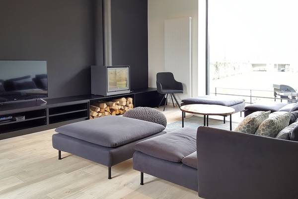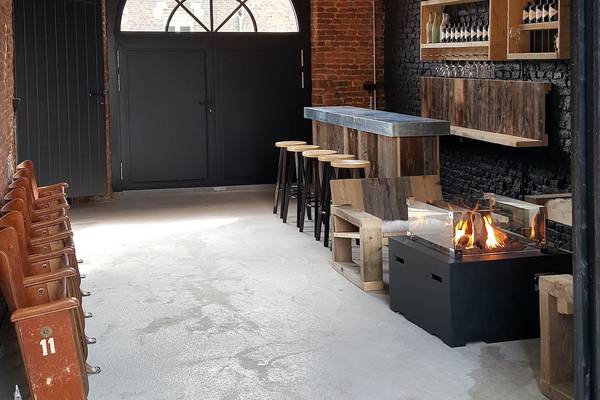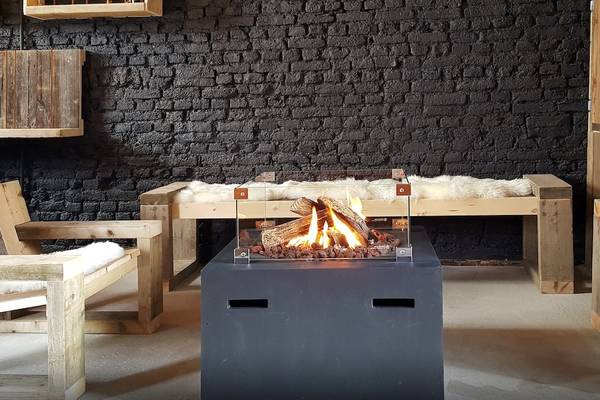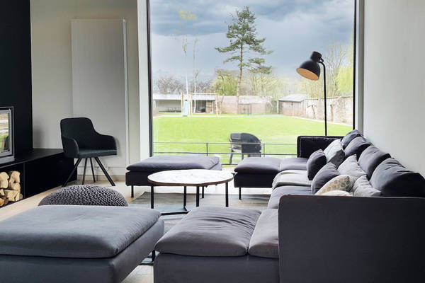 Et puis il y a le bar extérieur, l'un des atouts absolus de cette villa. Dans l'aile gauche de la maison, un salon cool a été créé avec des fenêtres industrielles, des murs en briques d'origine, une cheminée à gaz et des meubles robustes en bois d'échafaudage. C'est ici que vous vous préparez un gin-tonic, que vous gardez vos boissons au frais dans le grand réfrigérateur et que vous vous installez avec un bon verre au coin du feu. Il n'y a rien de plus confortable.