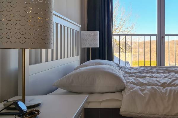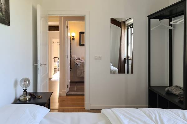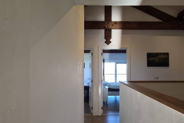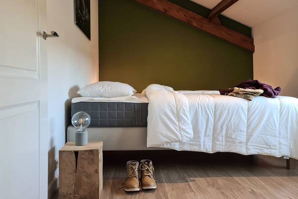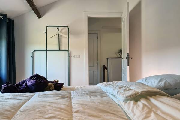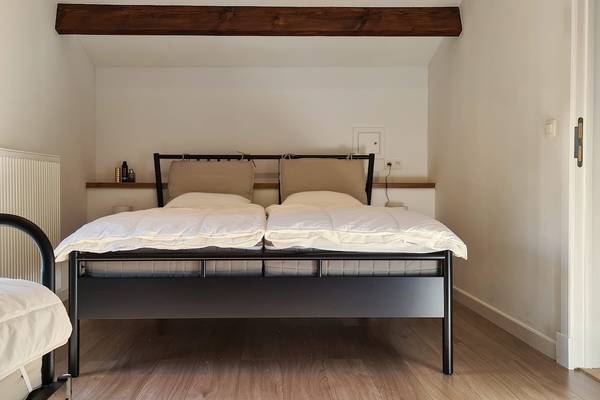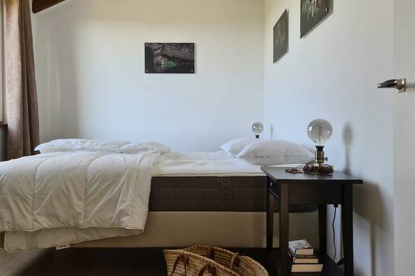 À l'étage se trouvent quatre chambres et deux salles de bains. Les trois chambres doubles spacieuses sont chacune équipées d'un lit confortable de 160 cm de large, avec des couettes séparées. De grandes fenêtres offrent une vue sur la vallée ou le jardin, et chaque chambre dispose d'un grand espace de rangement sous forme d'étagères ouvertes ou de casiers métalliques. La quatrième chambre dispose d'un lit simple et d'un lit double, ce qui est idéal pour les enfants ou les amis qui voyagent ensemble.