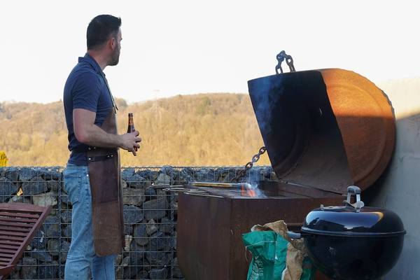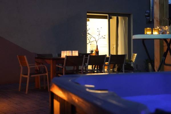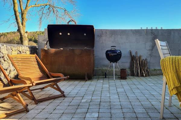 À l'extérieur, c'est un véritable sentiment de vacances qui vous attend. Depuis le salon, on accède au jardin par la terrasse, où se trouvent une grande table, des chaises longues et un impressionnant barbecue - une ancienne chaudière à mazout transformée en gril pour les vrais amateurs. Dans le jardin privé et isolé se trouve également le jacuzzi, toujours prêt à être utilisé. Tandis que l'eau bouillonne et que le soleil disparaît lentement derrière les collines, vous profiterez d'une vue qui est presque trop belle pour être vraie.