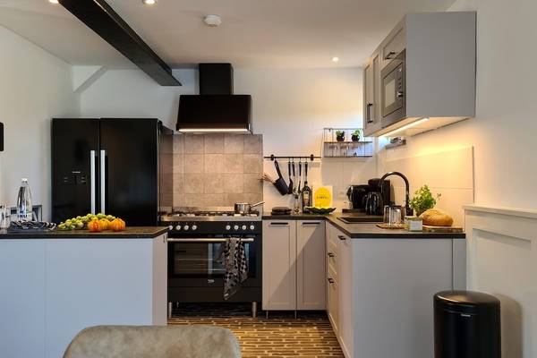 La cuisine semi-ouverte est entièrement équipée d'une grande cuisinière à 5 feux, d'un four, d'un micro-ondes, d'un lave-vaisselle et d'un réfrigérateur américain avec congélateur. Les amateurs de café peuvent choisir entre une cafetière classique ou un Nespresso. Même la machine à laver a été pensée, commodément intégrée dans le mur.