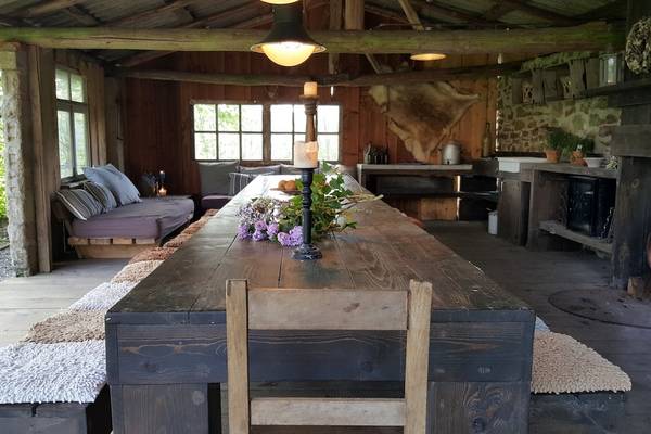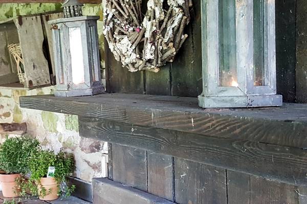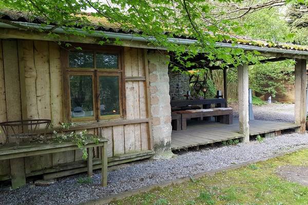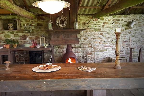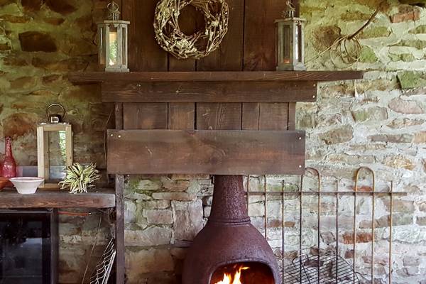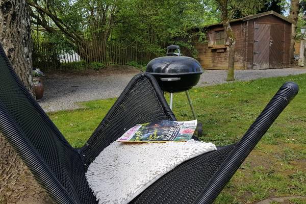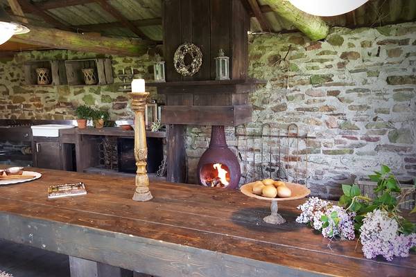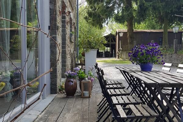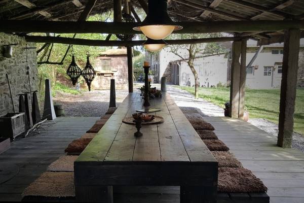 Et puis il y a l'espace extérieur - le cœur battant du Grand Ménil. Depuis l'espace de vie, vous entrez directement dans le jardin, où les vieux arbres donnent de l'ombre et où les oiseaux sifflent en arrière-plan. À l'avant se trouve une terrasse spacieuse, idéale pour prendre son petit-déjeuner au soleil du matin. Mais ce qui attire vraiment l'attention, c'est la robuste hutte couverte avec son poêle à bois : un espace extérieur robuste avec une grande table, un coin confortable pour se détendre et un foyer pour les soirées plus fraîches. C'est là que les hôtes passent le plus clair de leur temps, avec un bon verre de vin, un barbecue et la douce lumière des flammes.