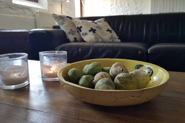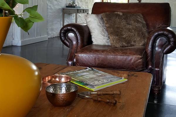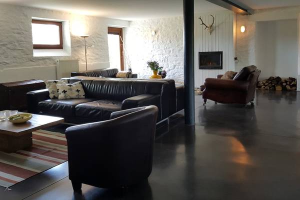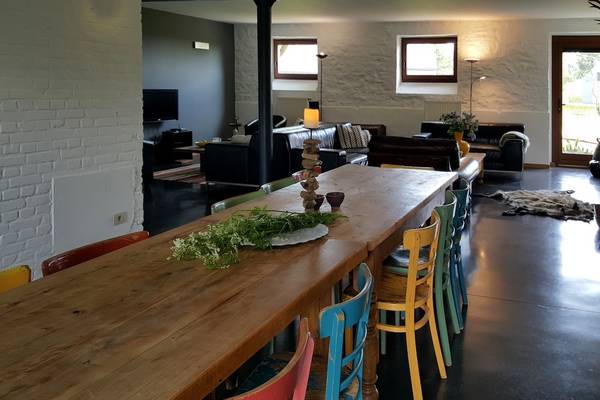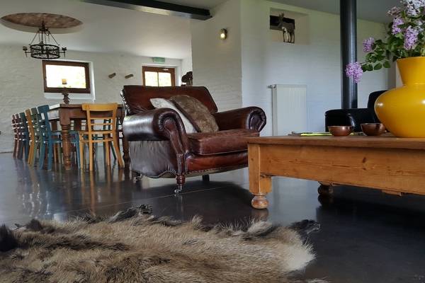 Dès que vous entrez dans la maison, vous ressentez le charme de la vie à la ferme combinée au confort moderne. Le hall d'entrée spacieux - anciennement les écuries - offre beaucoup d'espace pour les manteaux, les bottes et les chaussures de marche. De là, vous entrez dans le grand espace de vie, avec ses murs blanchis à la chaux, son magnifique sol en granit et son atmosphère authentique. Quatre généreux canapés Chesterfield sont disposés autour de la cheminée. C'est l'endroit idéal pour se détendre avec un verre de vin après une journée passée dans la nature. L'hôtel dispose d'une télévision à écran plat avec Belgacom et d'une connexion Wi-Fi.