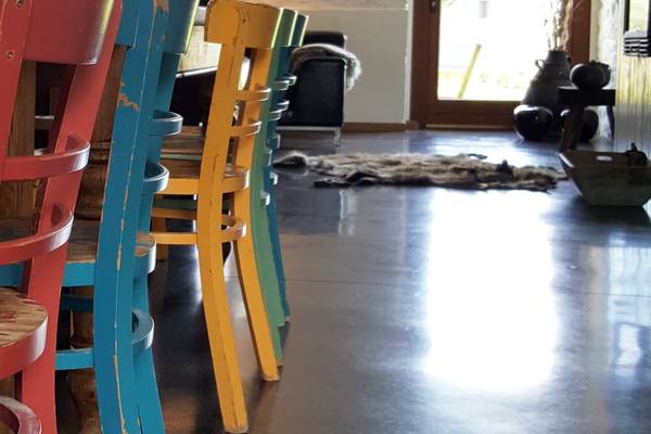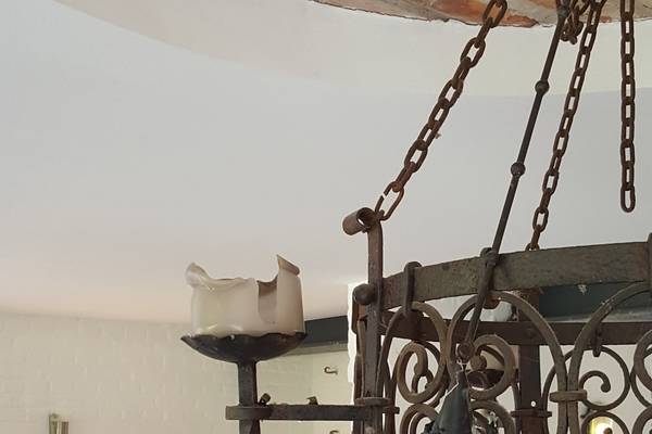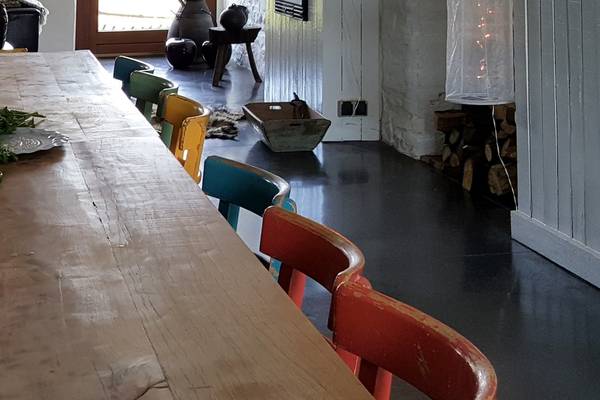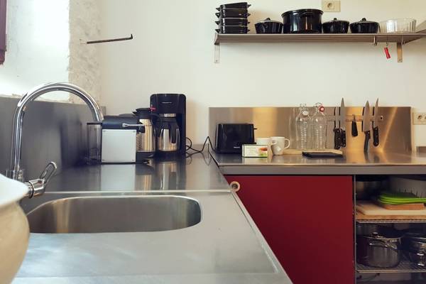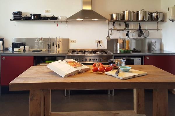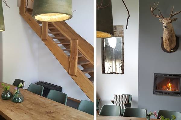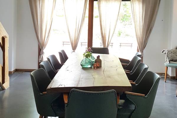 La table à manger invite à de longs dîners et à des conversations animées. Pendant que le feu crépite doucement dans la deuxième cheminée, vous êtes en contact direct avec la cuisine ouverte, de sorte que la cuisine et la salle à manger se fondent parfaitement. La cuisine est entièrement équipée pour les grandes réceptions : une plaque de cuisson au gaz à cinq feux, un four, un grand réfrigérateur avec congélateur, une bouilloire, une cafetière à filtre et une machine Nespresso. Sur le grand plan de travail en acier inoxydable, vous pouvez préparer sans effort un dîner pour tout le groupe, tandis que l'armoire à vaisselle vintage garde tout à portée de main.