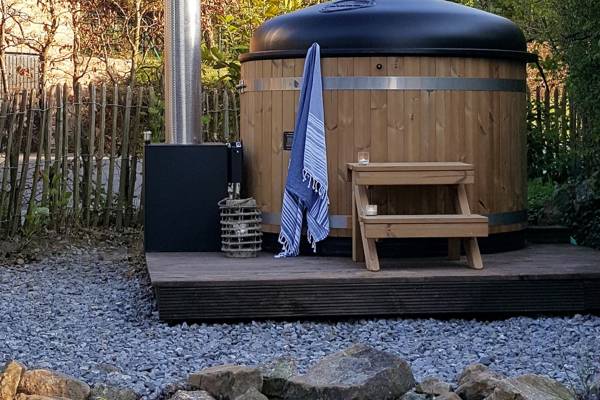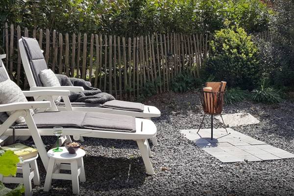 À l'extérieur, le jardin s'étend, orienté au sud et donc baigné de soleil toute la journée. On peut s'y asseoir à la table à manger ou s'allonger sur les chaises longues. Et puis, il y a un endroit qui attire tout le monde : le bain à remous chauffé au bois. Le rituel du remplissage et de l'allumage est une expérience en soi. Quelques heures plus tard, vous flottez dans l'eau chaude, avec les étoiles au-dessus de vous et le silence de la nature autour de vous.