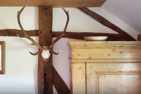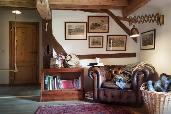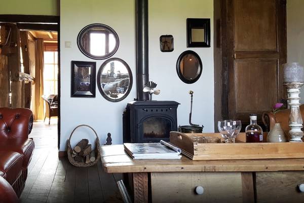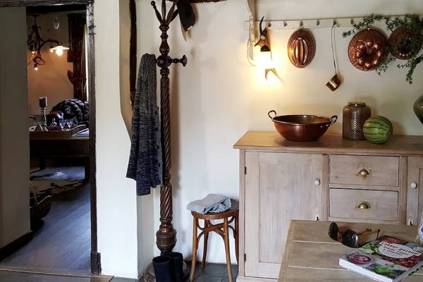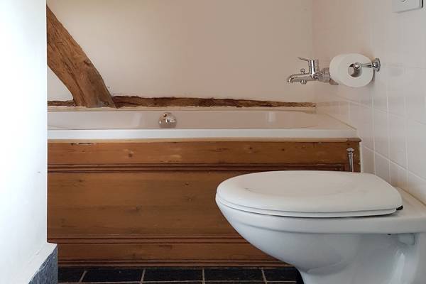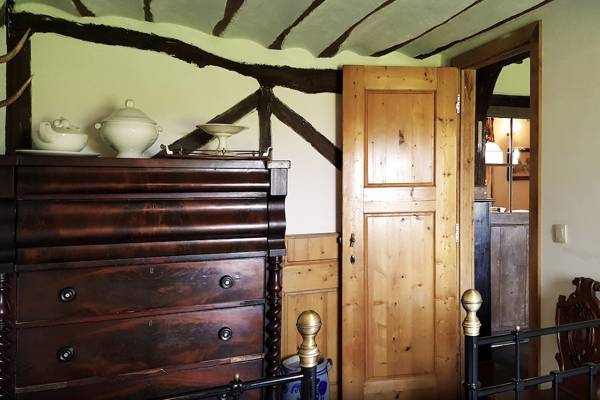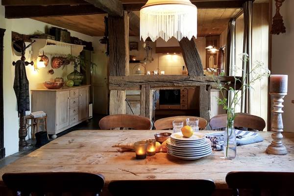 En entrant dans l'ancienne ferme à colombages, vous pénétrez immédiatement dans le cœur de la maison : la cuisine de la ferme. À droite, la cuisine s'étend, spacieuse et entièrement équipée, et donne sur le jardin ensoleillé. À gauche, la cheminée crépite dans le poêle à bois à côté de la table à manger - un endroit qui invite à de longues soirées de conversation et de convivialité.