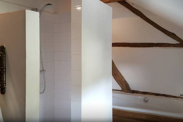 On accède au premier étage par l'escalier en bois. Là, une chambre spacieuse avec un généreux lit double vous attend, ainsi qu'une deuxième chambre qui vous invite également à passer de merveilleuses nuits sous une épaisse couette. La salle de bains est une oasis en soi : une grande douche à l'italienne, une baignoire et un deuxième WC. Cerise sur le gâteau : un sauna infrarouge sur le palier, avec luminothérapie et musique - idéal après une longue promenade dans les bois ardennais.