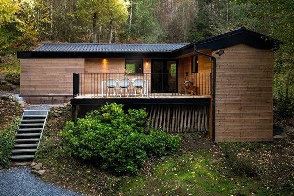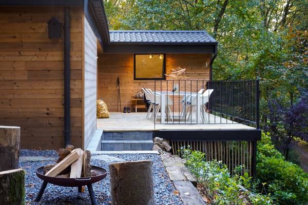 Le chalet est entouré d'un jardin boisé avec des pelouses, des marches et des espaces pour s'asseoir. La grande terrasse à l'avant est l'endroit idéal pour prendre un apéritif ou un repas d'été en plein air. Vous pouvez facilement garer votre voiture le long du chemin de terre, directement sous la maison.
