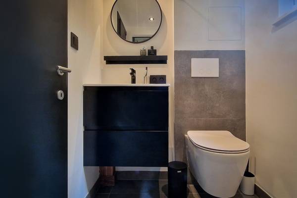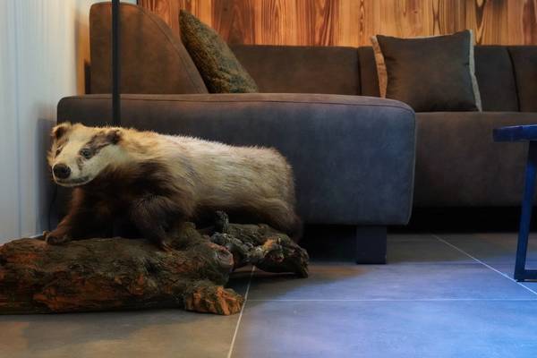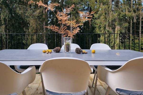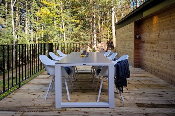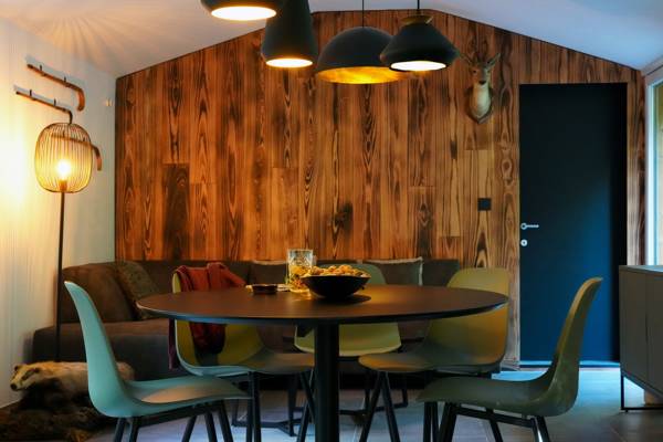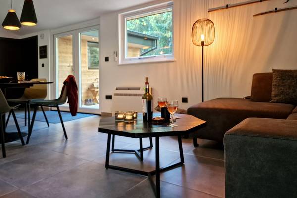 En passant par la terrasse avant, vous entrez dans la salle de séjour lumineuse. Ici, un canapé confortable vous invite à vous installer près de la cheminée tout en profitant d'un film sur la télévision intelligente ou simplement du silence de la forêt.