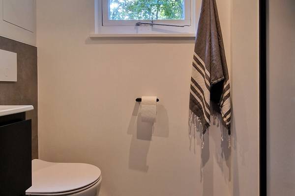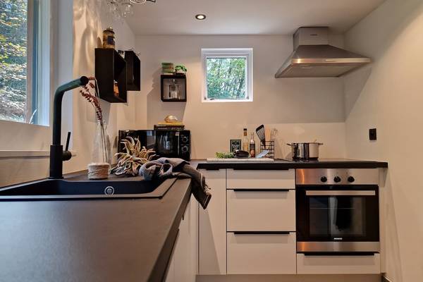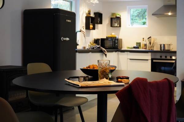 La cuisine ouverte jouxte la salle à manger avec une table ovale - un endroit chaleureux pour cuisiner, manger et profiter ensemble. Tout ce dont vous avez besoin est là : une plaque à induction, un four, un micro-ondes, un réfrigérateur, un lave-vaisselle et même une machine à café Dolce Gusto. Pendant que vous cuisinez, vous avez une vue sur la verdure à l'extérieur.