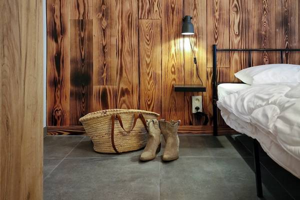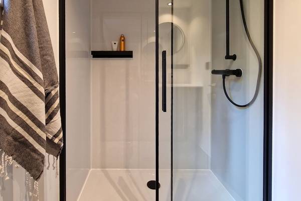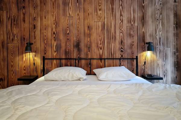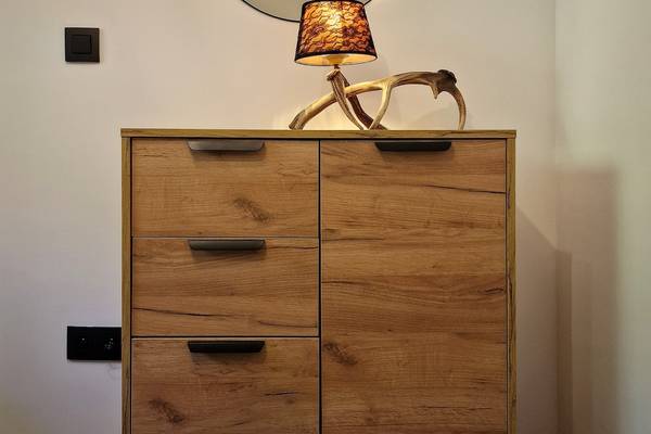 Le chalet dispose de deux chambres à coucher. La première est meublée d'un grand lit double et d'une armoire spacieuse. La deuxième chambre est idéale pour les enfants ou les amis, avec des lits superposés : au-dessous un lit double (140x200) et au-dessus un lit simple (90x200). La salle de bains moderne se trouve à côté de la cuisine et offre une douche à effet de pluie spacieuse, un lavabo avec tiroirs et des toilettes.