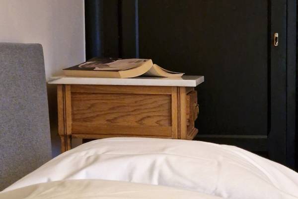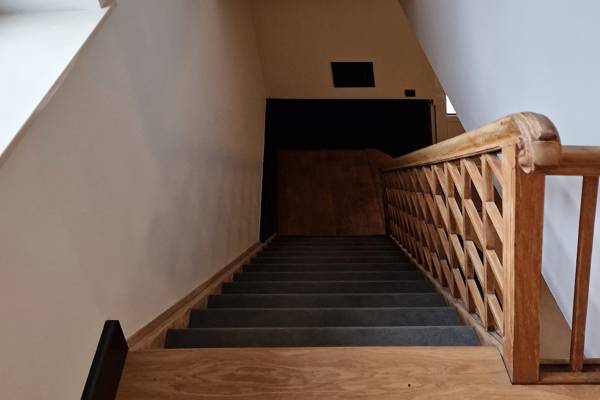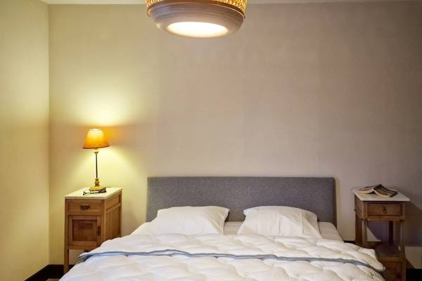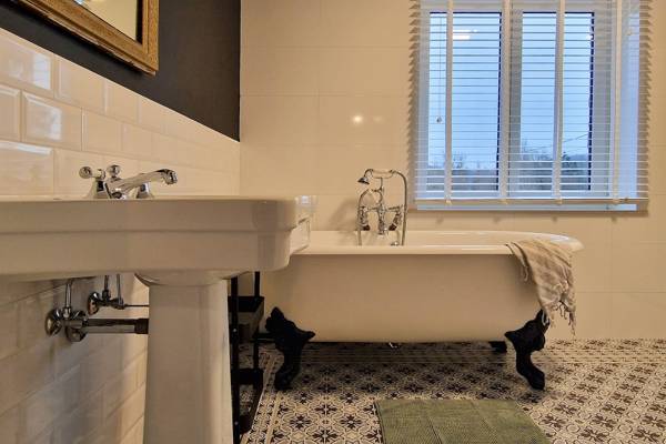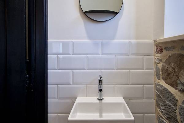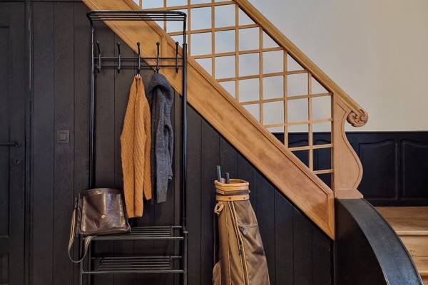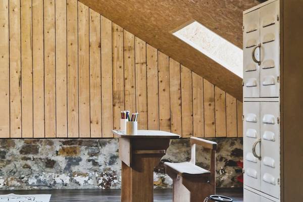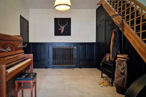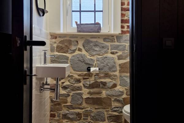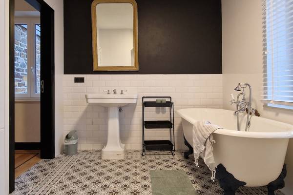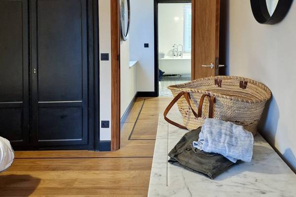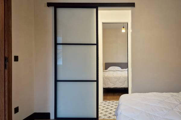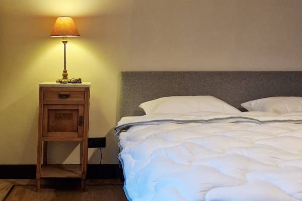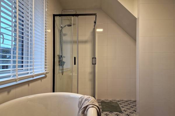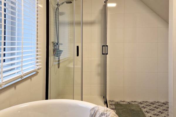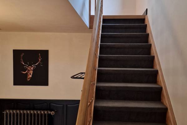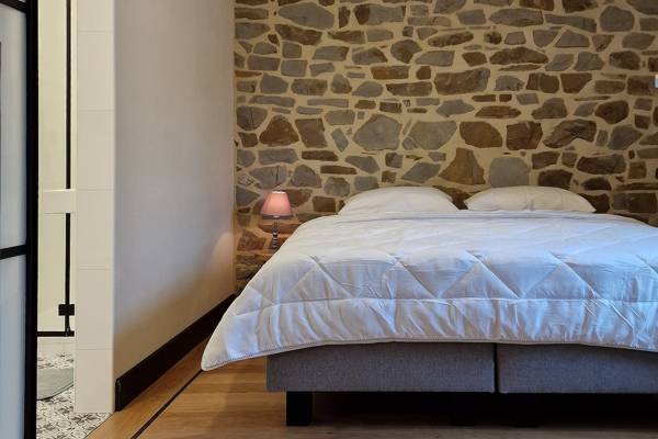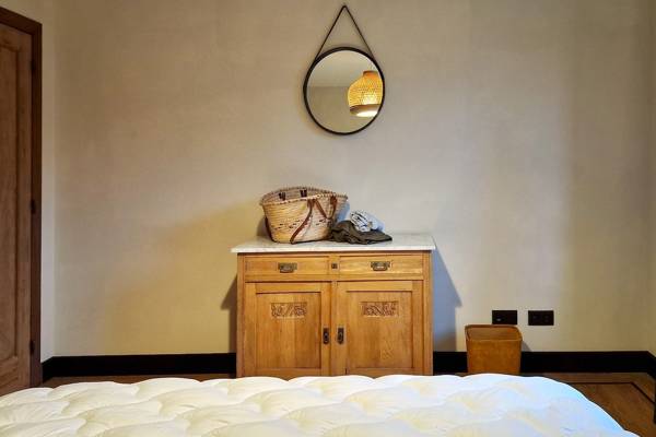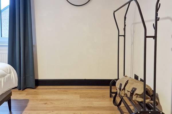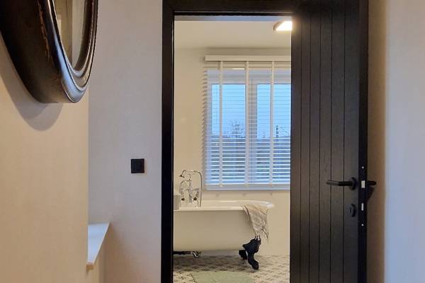 Au premier étage se trouvent cinq chambres spacieuses. Deux d'entre elles partagent une salle de bains, fermée par des portes coulissantes industrielles. Cette salle de bains est équipée d'une douche, d'un lavabo et de toilettes. Les trois autres chambres sont équipées de lits doubles confortables avec des couettes simples. Une deuxième salle de bains spacieuse offre un confort supplémentaire avec une baignoire autoportante, une douche spacieuse et un lavabo élégant.