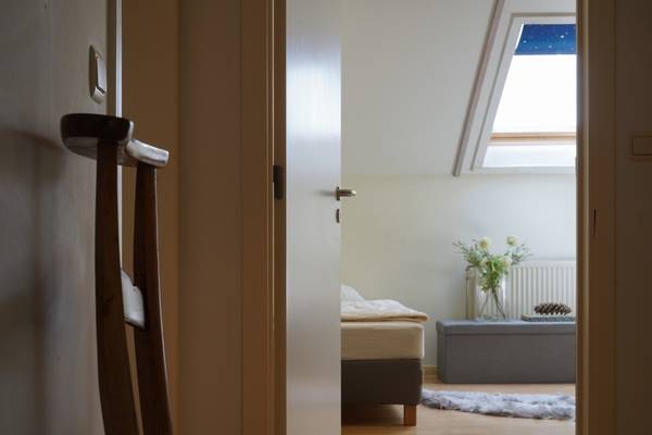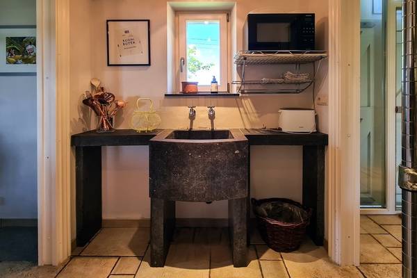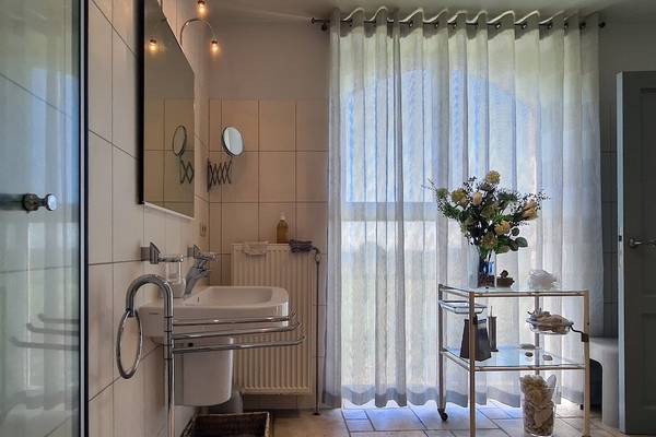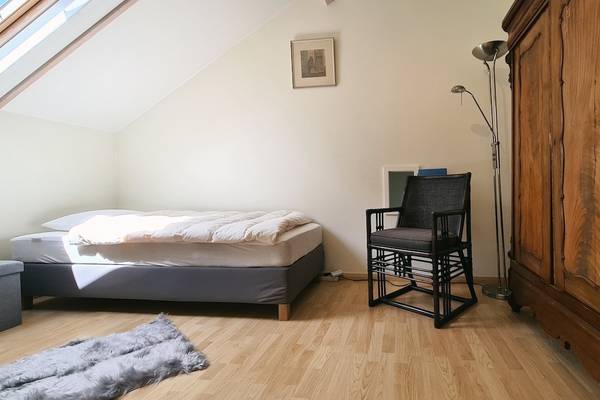 Au rez-de-chaussée se trouve une chambre spacieuse avec un lit double de 200 cm (avec deux couettes simples). Cette chambre dispose d'une salle de bains privée avec douche à l'italienne, baignoire et lavabo, et convient aux personnes à mobilité réduite.