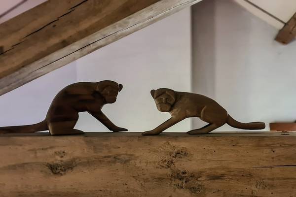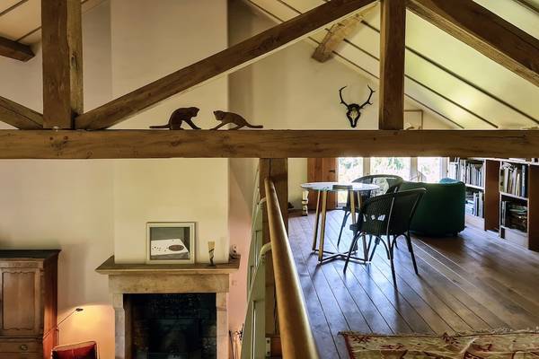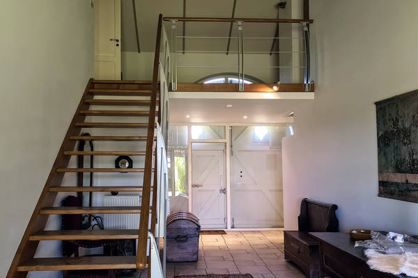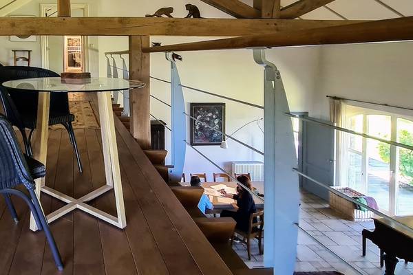Un impressionnant escalier en bois vous mène au premier étage. La mezzanine est remplie de livres et de coins lecture confortables, avec vue sur le salon en contrebas. Veuillez noter que cet étage ne convient pas aux enfants en bas âge.