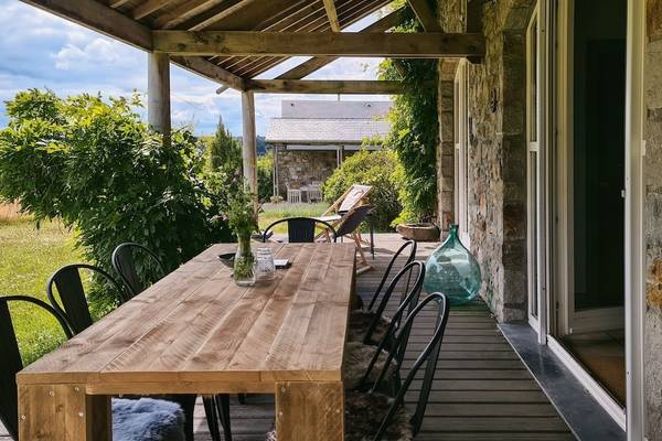 Le style rural de la maison s'intègre harmonieusement à son environnement. Le grand jardin avec sa véranda couverte vous invite à profiter du paysage ardennais en toute saison. Grâce à la tonte limitée de l'herbe autour de la maison, le jardin s'intègre parfaitement dans les prairies et les vallées environnantes.