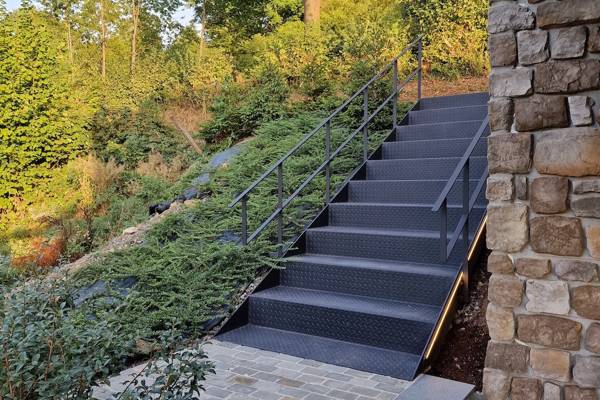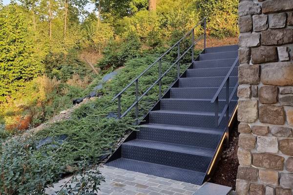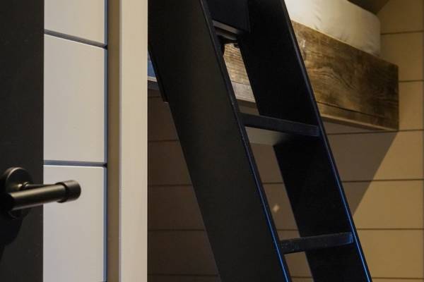 Een stalen trap leidt je naar deze stijlvolle lodge, diep verscholen in een rustige vallei.