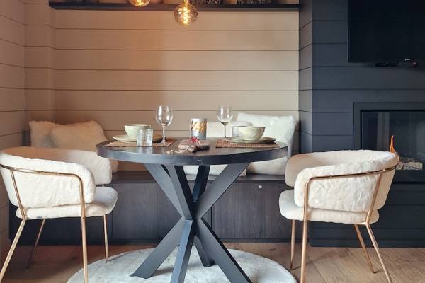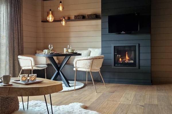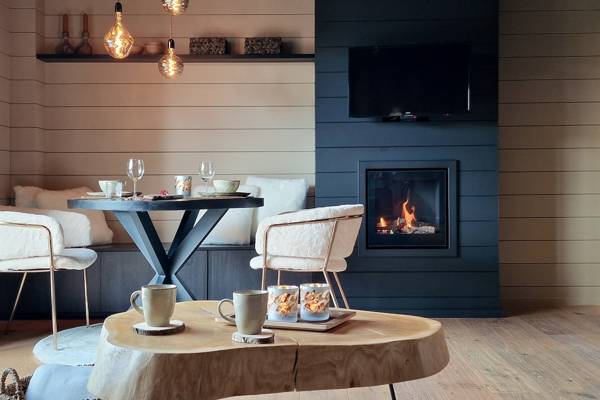 Binnen wacht een warme leefruimte met sofa, fauteuil en moderne gashaard. Grote ramen laten het landschap binnenstromen. De open keuken is volledig uitgerust en grenst aan een sfeervolle eethoek met handgemaakte tafel en elegante verlichting.