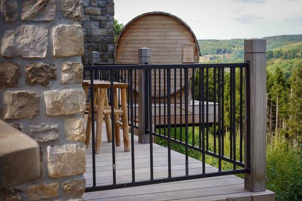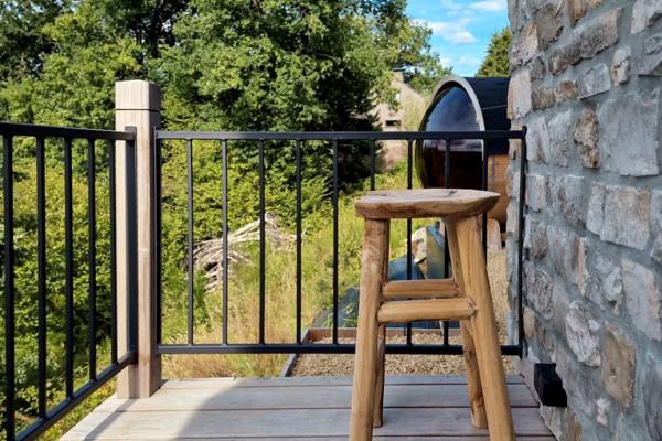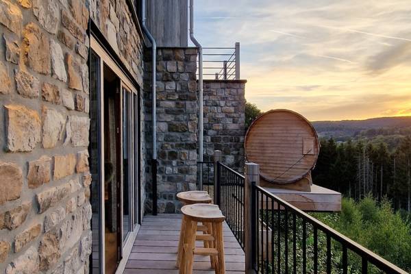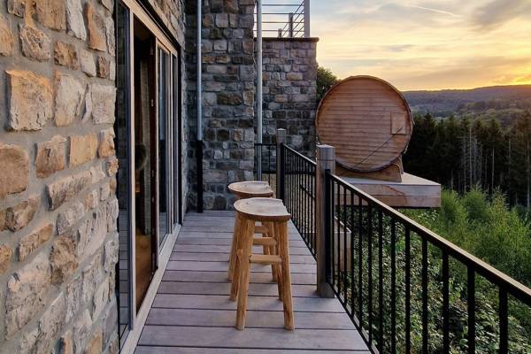 Buiten vind je twee terrassen: een intiem zijterras met relaxstoelen en een panoramaterras met uitzicht over de vallei. En als kers op de taart: een Finse sauna met uitzicht én een houtgestookte hottub, perfect voor een avond onder de sterren.